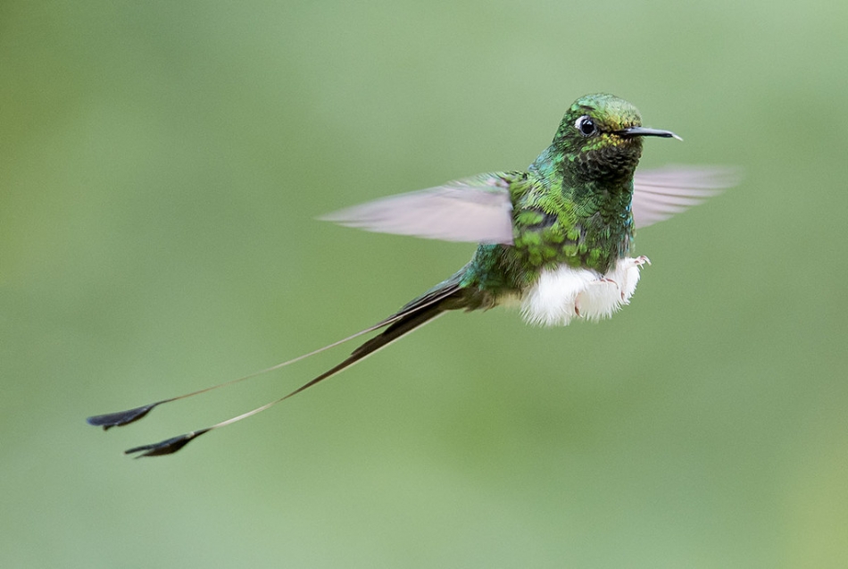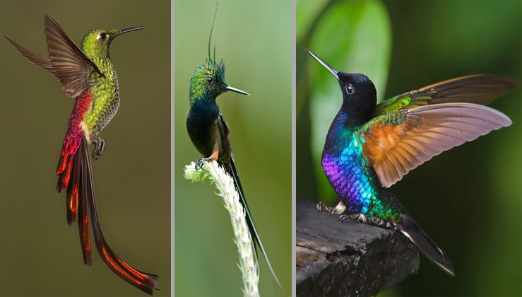 White-Booted Racket-Tail Hummingbird: White-booted racket-tail hummingbirds (Ocreatus underwoodii) are known for their wispy leg puffs—”booties”—and two elongated tail feathers ending in iridescent, racket-like flares. Only males have the latter feature. Because the white-booted racket-tail hummingbird can reach into the long tubular flowers that exclude bees or butterflies from access, many flowering plants in their native South America rely on the species for pollination.