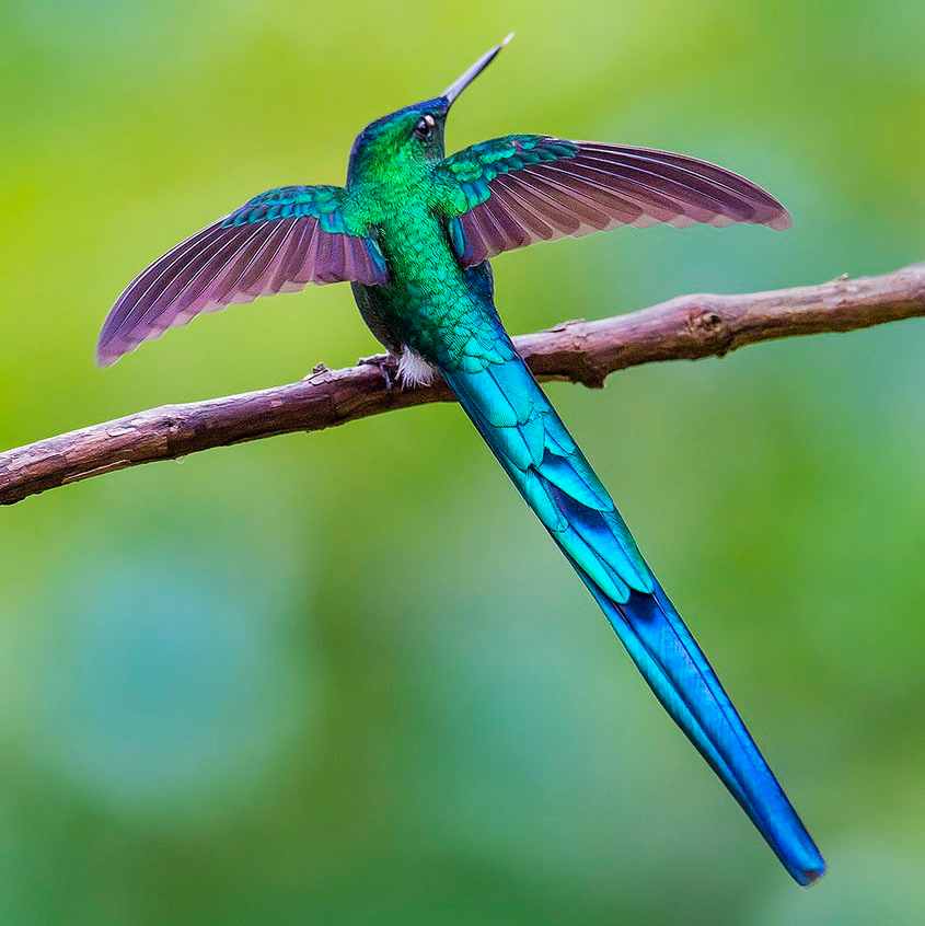 Marvellous Spatuletail: The Marvelous Spatuletail, like many hummingbird species including the Black-eared Fairy and Rainbow-bearded Thornbill, has a name that is both charming and descriptive. This beautiful little hummingbird shines in shades of white, green, and bronze; the male also sports vivid blue crest feathers, a brilliant turquoise gorget, and a black line on its white underparts. The only member of the genus Loddigesia, the species was first described in 1835. It’s only found in the Rio Utcubamba Valley in northern Peru. The Marvelous Spatuletail’s unique tail has only four feathers — which the male uses as a prop in amazing performances.