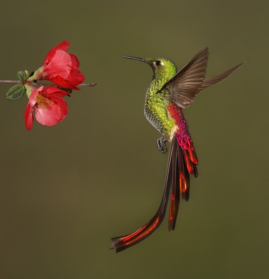 Red-tailed Comet: The Sappho sparganura (scientific name) or red-tailed comet is found not only in woodlands, but also around human habitation in the Central Andes of Argentina and Bolivia. 8.6 inches in length, this bird is easily identifiable because of its tail. It has a long, metallic golden-red tail. The head and wing plumage is moss green, while the upper body is red. Its diet is comprised mainly of nectar taken from brightly coloured and scented flowers. Sometimes they are known to eat insects and spiders. An average clutch-size has 2 eggs which are laid in a nest made by the female alone. Even incubation is carried out by only the female, while the male defends its territory. Its IUCN listing is the LEAST CONCERN.