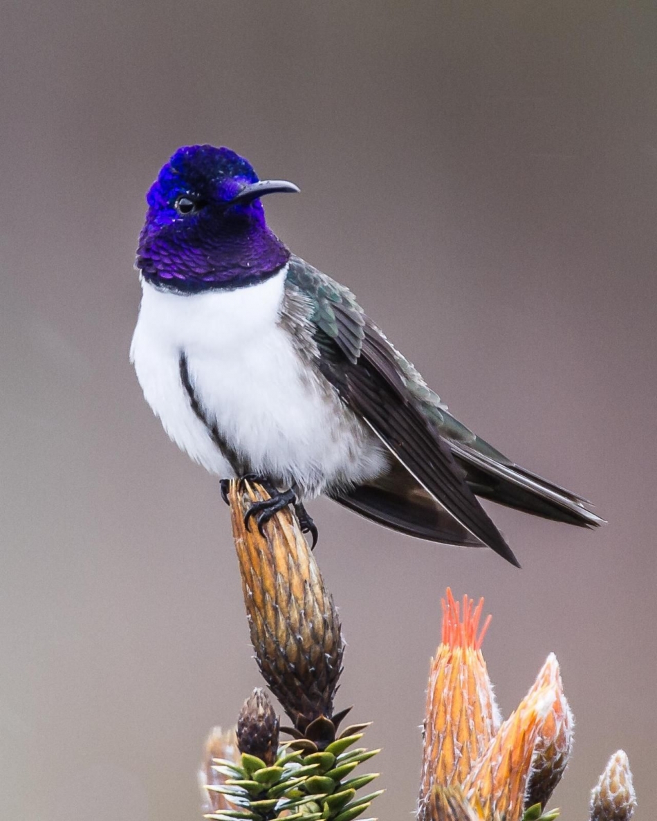 Velvet-Purple Coronet: The velvet-purple coronet (Boissonneaua jardini), native to the humid foothill forests of western Colombia and northwestern Ecuador, has such a rich coloration it may appear black at first, particularly if it’s dark outside. When the light catches its iridescent plumage, though, flashes of vivid purple, blue, and green appear. The underparts of its wings are a contrasting chestnut color.