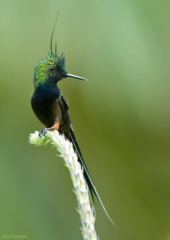 Wire-crested Thorntail: The alien-esque appearance of this hummingbird truly has to be seen to be believed! Its long antenna-like head feathers are balanced out by its spectacularly long tail. They can be seen buzzing around the eastern slope of the Andes.