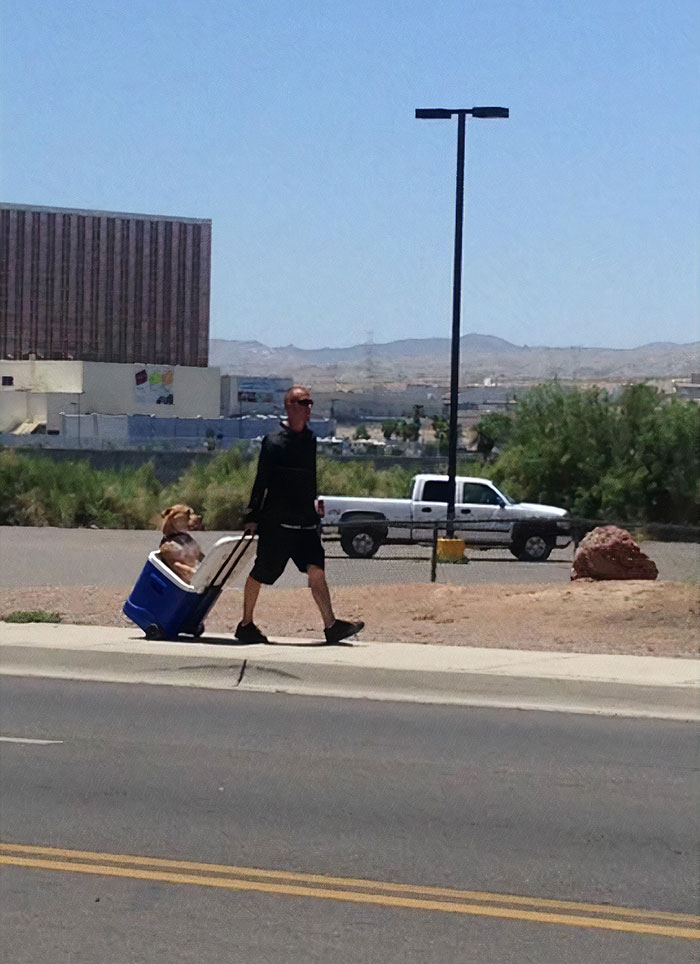 #7 Guy In Hot Arizona Heat Did Not Want His Dog’s Paws To Burn So He Pulls Him In A Cooler