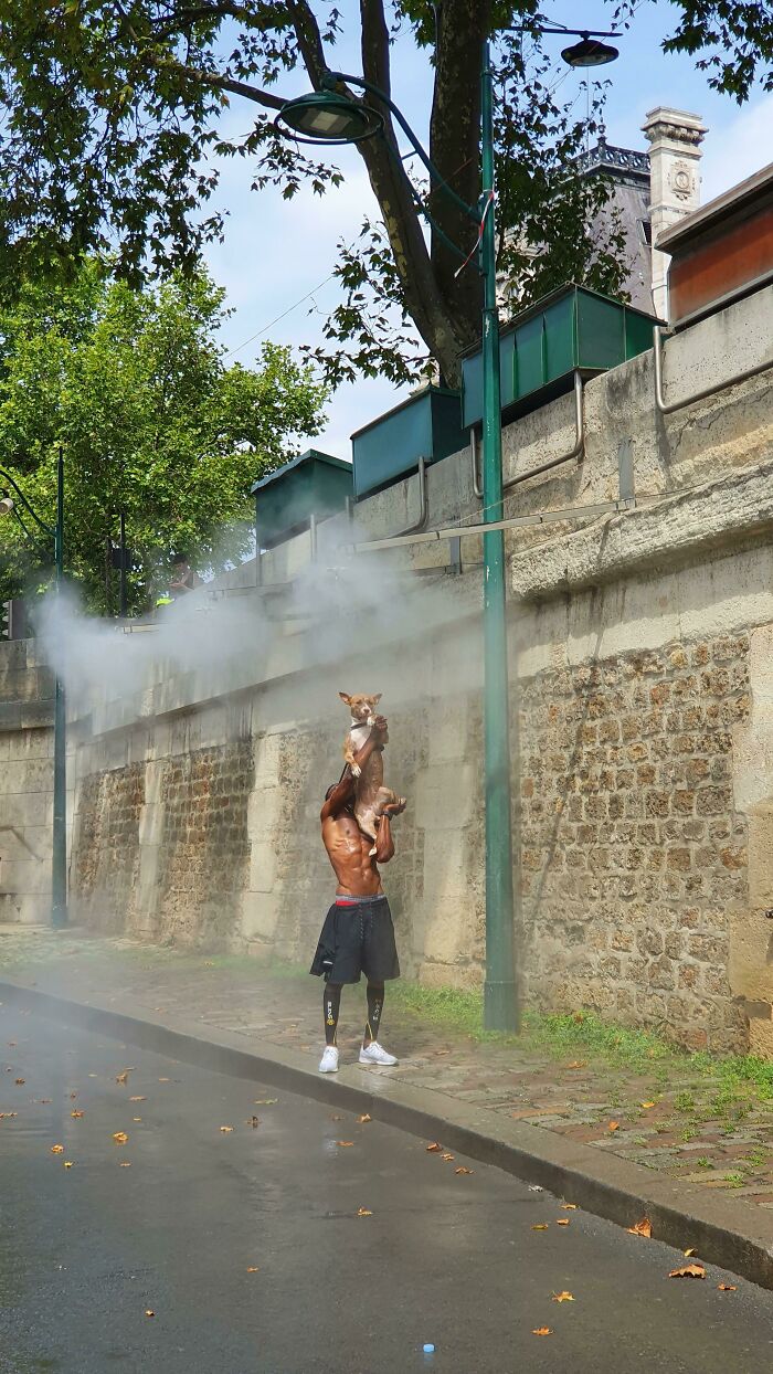 #29 I Spotted This Guy In Paris Helping His Pupper Cool Off In The 40°C Heatwave