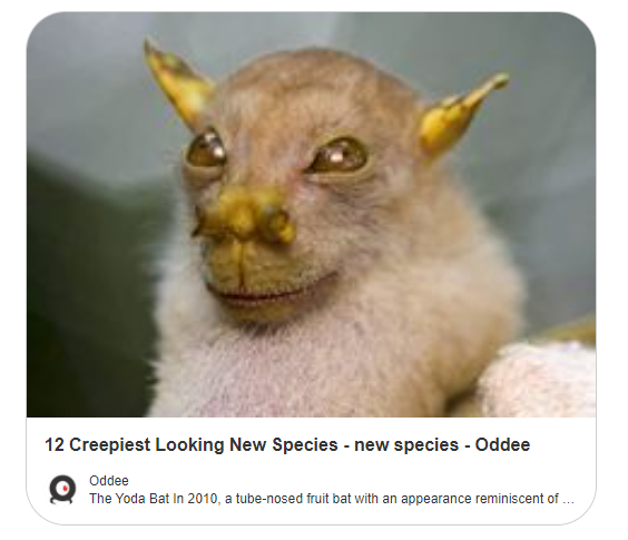 Tube-nosed fruit bat: The tube-like nostrils are the reason for this bat’s name. It likes to eat fruit and these unique nostrils allow it to breathe while it pushes its face into the fruit to suck the juice. This tube-nosed fruit bat is just one of the roughly 200 species encountered during two scientific expeditions to Papua New Guinea in 2009—including a katydid that “aims for the eyes” and a frog that does a mean cricket impression