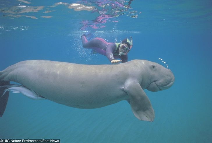 Dugong: They are very big, but very gentle and peaceful animals. Dugongs are the only marine mammals which are 100% vegetarian. To support their size, they have to eat about 50kg of sea grass every day. The shape of their face and upper lip are perfectly designed for grazing on sea grass from the ocean floor.