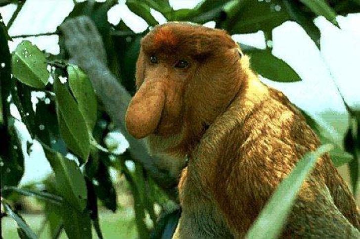 Proboscis monkey: When you see this monkey, the first thing you notice is the nose. It can be up to 7 inches long. The males generally have larger noses than the females. Monkey researchers believe that the larger the male’s nose is, the more attractive it looks to females. Proboscis monkeys are endemic to the jungles of Borneo, never straying far from the island’s rivers, coastal mangroves, and swamps. They are a highly arboreal species and will venture onto land only occasionally to search for food. They live in organized harem groups consisting of a dominant male and two to seven females and their offspring. Various groups often congregate near water at night to sleep.