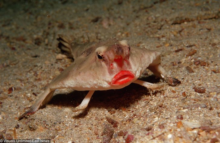 Red-lipped batfish: This very strange looking fish can be easy recognized by its bright red lips. It really looks like this fish is wearing lipstick! They also have a very unique way of “walking” on the bottom of the ocean using their modified fins. Red lipped batfish is unique in the world with a feature. This fish is only fish species in world that can walk with 4 feet. Although its fins are designed to walk, sometimes it can swim as shaking its tail but this doesn´t happen everytime. Maybe its discontented facial expression is because it has to walk over.