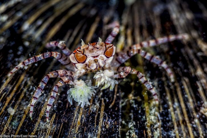 Boxer crab: These crabs became famous because of the way they move. They always carry a small sea anemone in each claw, like boxing gloves, which is how they got their name. They do this for 2 reasons – defense and food catching. Boxer crabs feed sea anemones in exchange for defense from danger — serving as a prominent example of symbiosis in the animal kingdom. Lybia tessellata is a tiny crustacean native to the tropical Indo-Pacific Ocean. These crabs are usually patterned with pink, brown, or yellow and reach about an inch in width. They bear slim claws and a front pair of walking legs that are longer than the other three pairs.