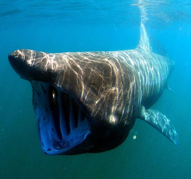 Basking shark: The basking shark is a plankton eating shark, but it looks terrifying. These sharks are the second largest on the planet and known for having a massive liver, which comprises approximately 25% of their body weight. They were considered endangered not long ago due to extensive hunting, but their numbers have been rising lately.