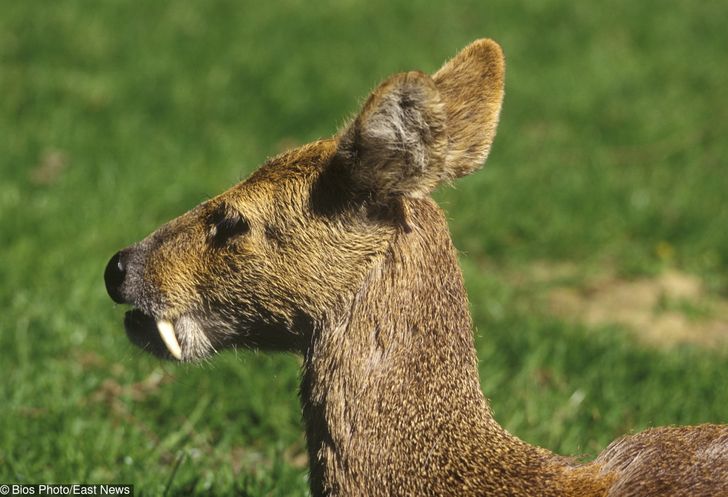 Chinese water deer: These beautiful animals have a very unique feature, male deer have long canine teeth, which can grow up to 8cm long. They are very territorial and males use their fangs in fights. They are also fantastic swimmers, capable of swimming for several kilometers between islands. It is the only species of deer in which males lack antlers; instead, they are armed with long, curved, and sharp upper canine teeth that protrude from the mouth. These tusks may exceed 5 cm (2 inches) in length. The water deer is also the only deer with inguinal glands.