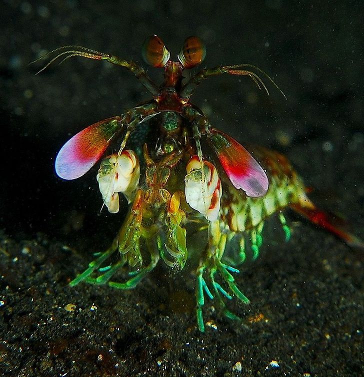 Mantis shrimp: Technically they are not shrimp, they are actually stomatopods which are relatives of shrimp, crabs, and lobsters. They have a very serious and extraordinary weapon – powerful hummer-like and very sharp claws which they can accelerate at a speed of 53 mph. When scientists study them, they have to use plastic tanks because this little thing can easily break glass.