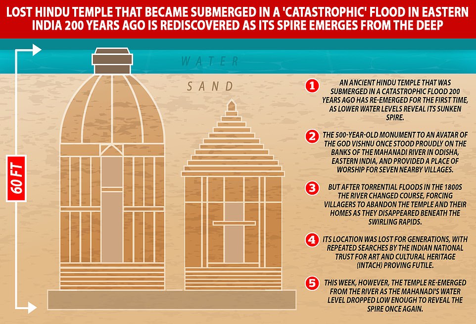 A 500-year-old temple in India that was once lost to flooding has been rediscovered after its spire has emerged from the river.