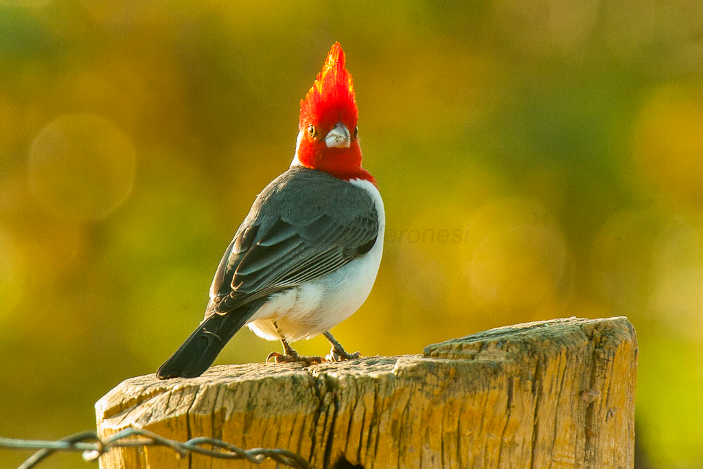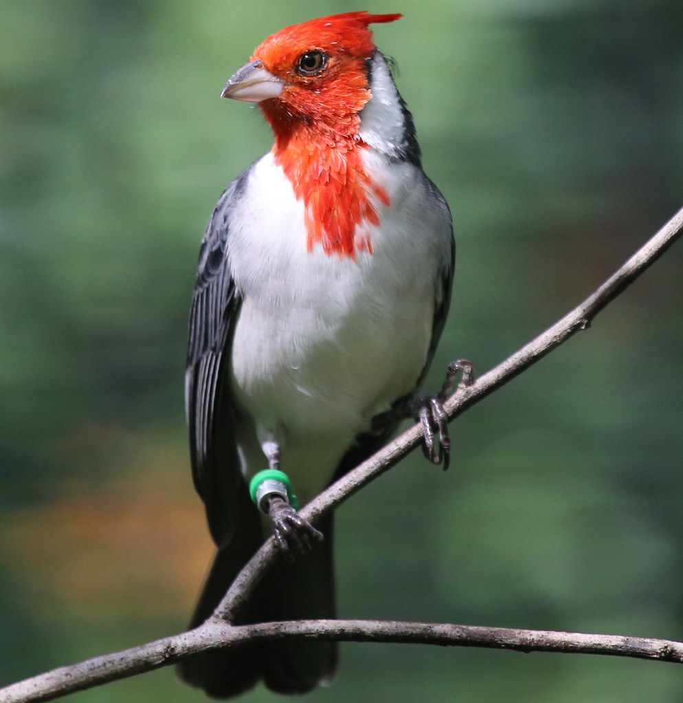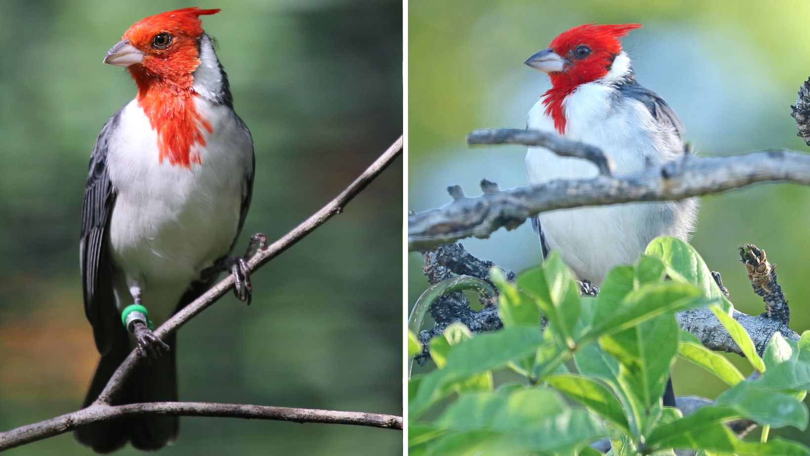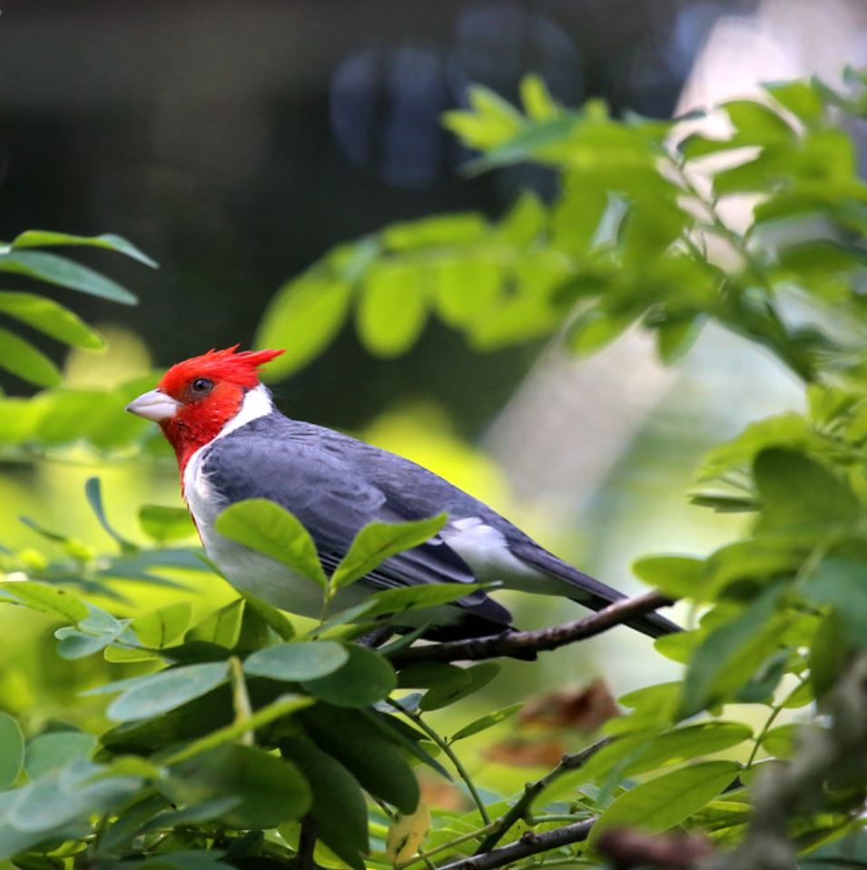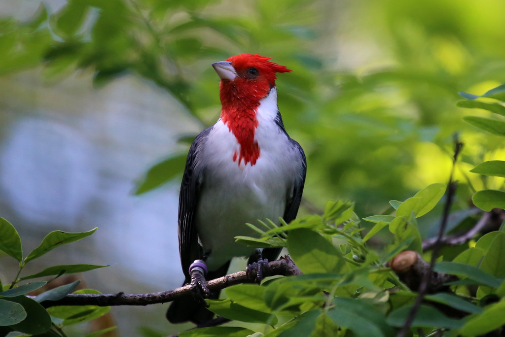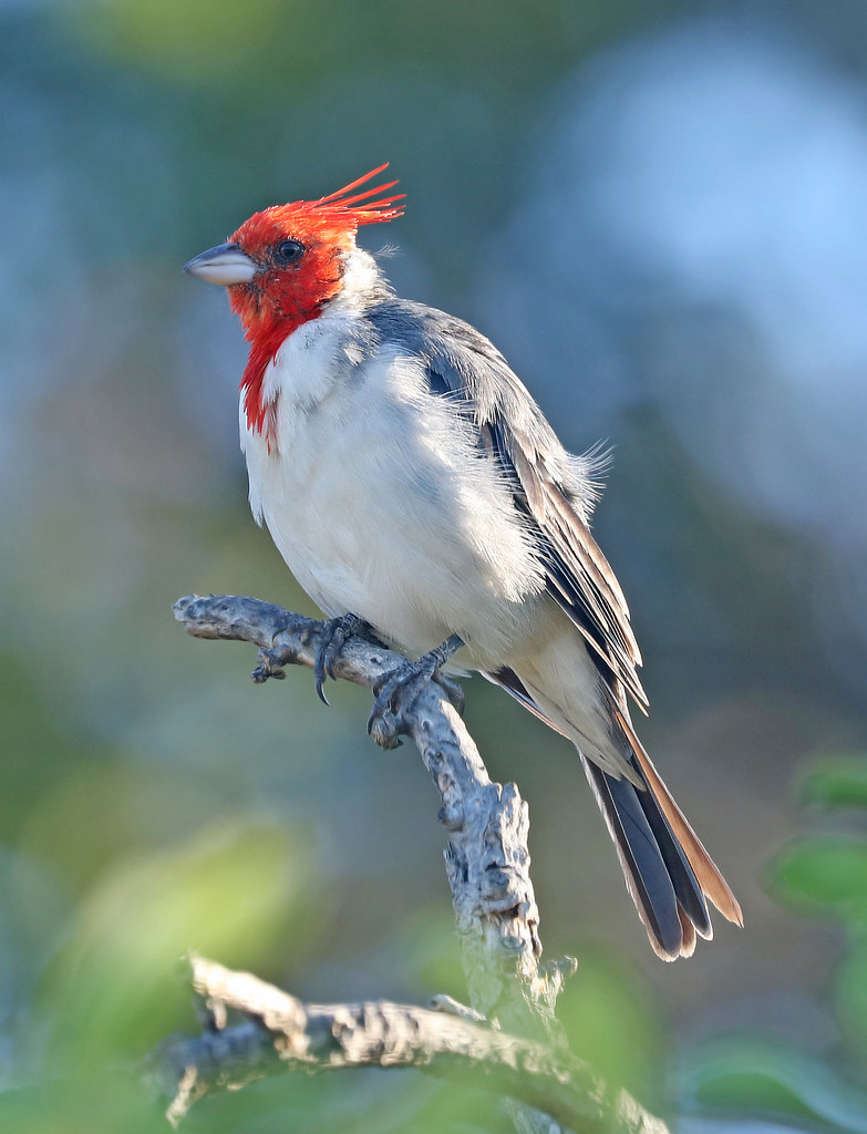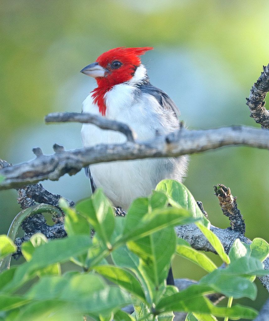 The red-crested cardinal (Paroaria coronata), is a songbird species belonging to the family of tanagers (Thraupidae). A medium-sized bird, they are easily recognized with a redhead, and a red bib along with a short red crest raised at will when they are excited.
