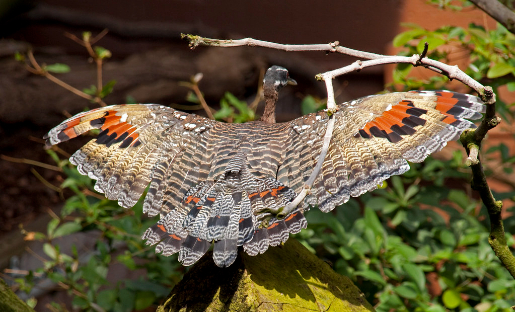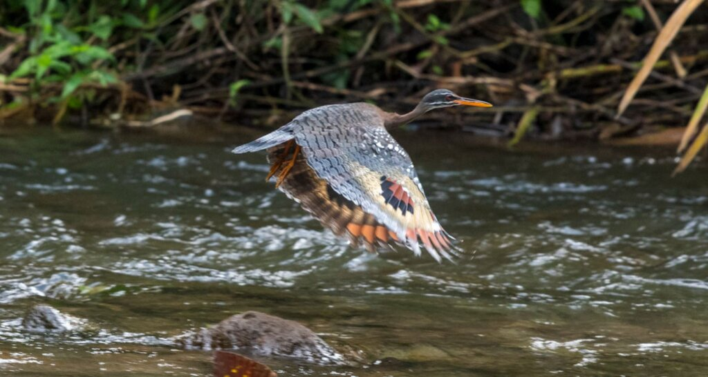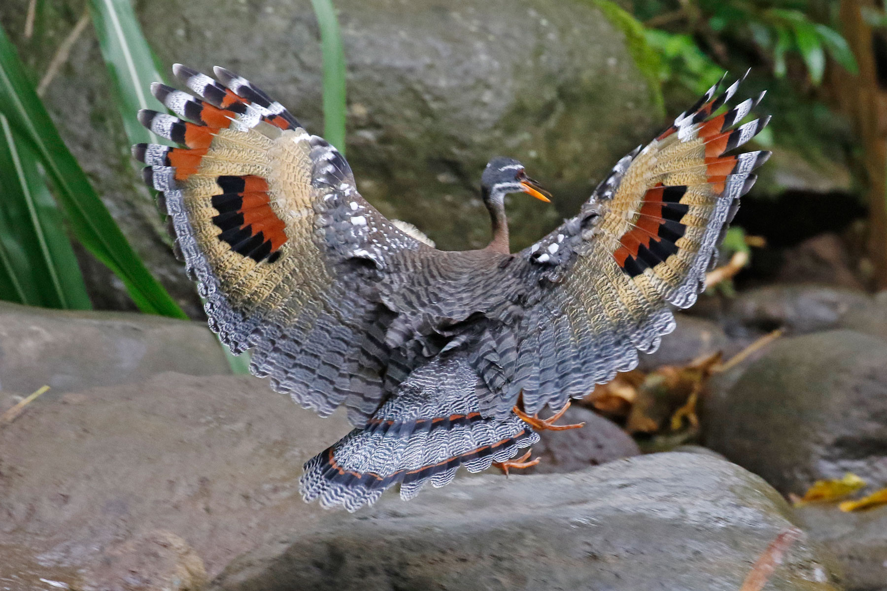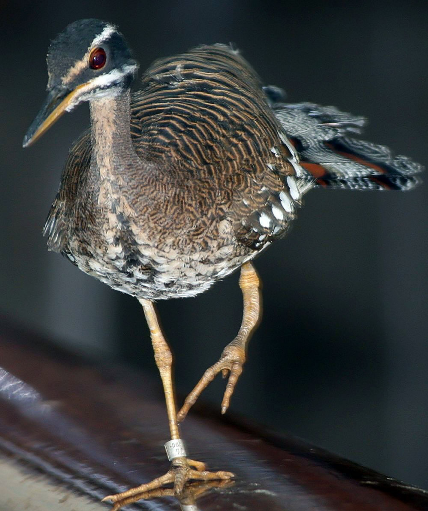 The sunbittern (Eurypyga helias) is a bittern-like bird living in the tropical regions of the Americas that shares many physical characteristics with other Bitterns. Their plumage is black, grey, and brown. The flight feathers are vividly colored in the center and when the wings are spread – exhibit a pattern that resembles bright eyespots in red, yellow, and black. The bird has a generally subdued coloration, with fine linear patterns of black, grey, and brown. Its remiges however have vividly colored middle webs, which with wings fully spread show bright eyespots in red, yellow, and black. These are shown to other sunbitterns in courtship and threat displays or used to startle potential predators. The color of the legs and feet ranges from yellowish-orange to reddish. The bill is long and pointed.