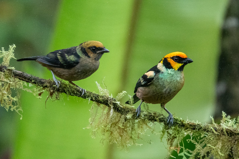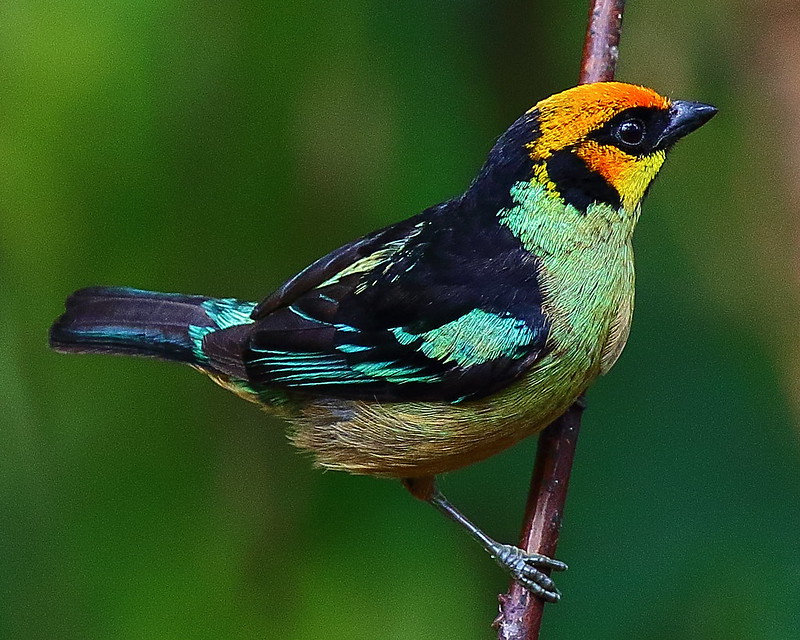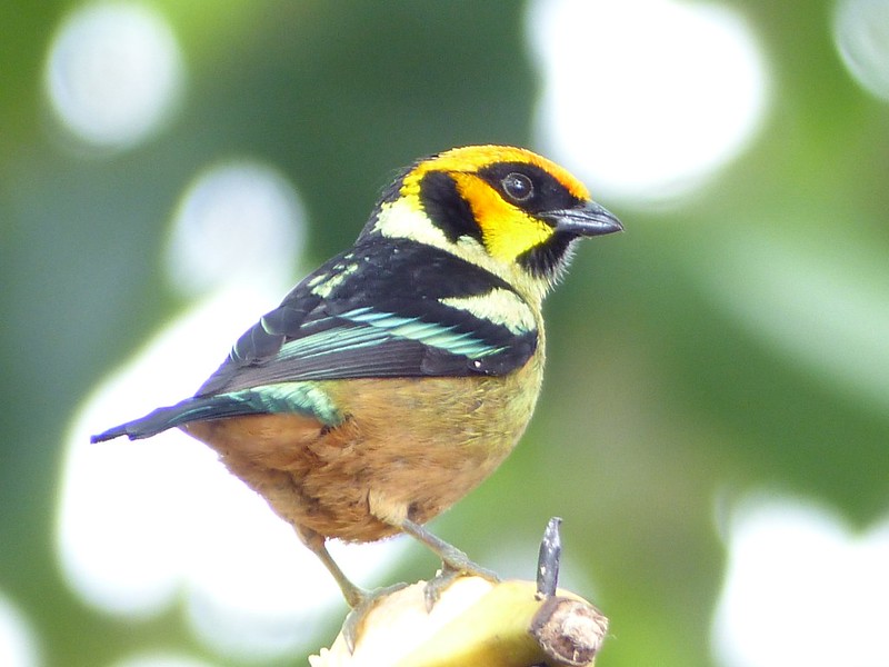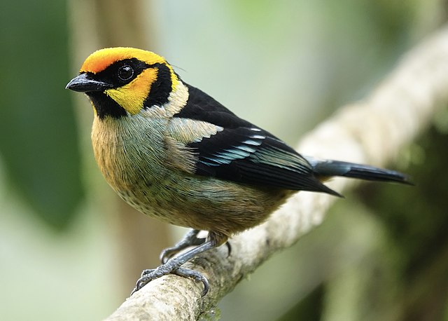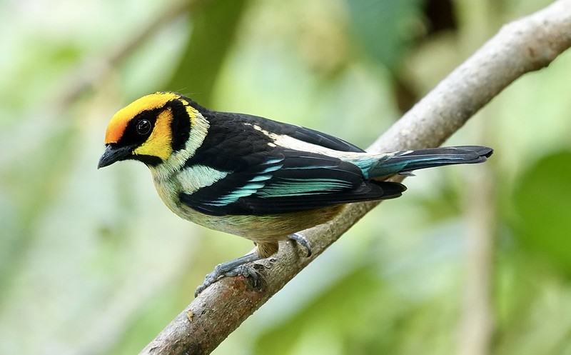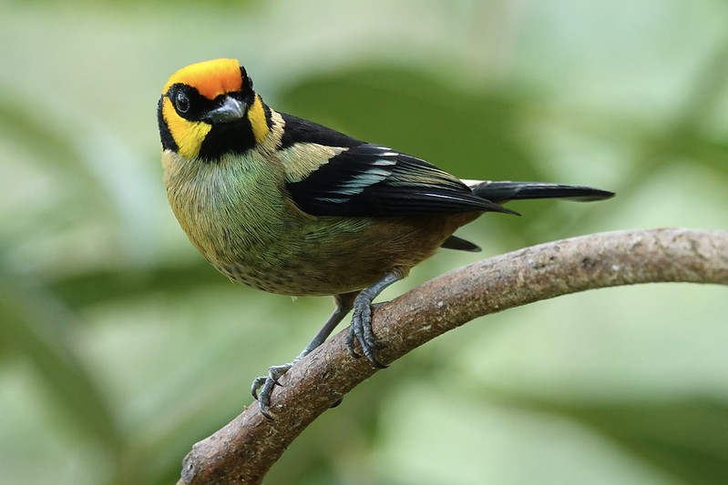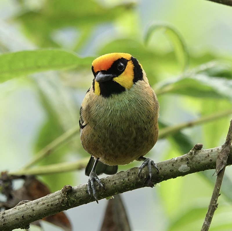 The flame-faced tanager (Tangara parzudakii), is a species of bird in the Thraupidae family. Sporting a bright orange forehead and cheeks which turn to yellow on the rest of the head. He also has a black throat and ear patch. The upperparts are black with a greenish-yellow shoulder patch and yellow and green-buff rump.