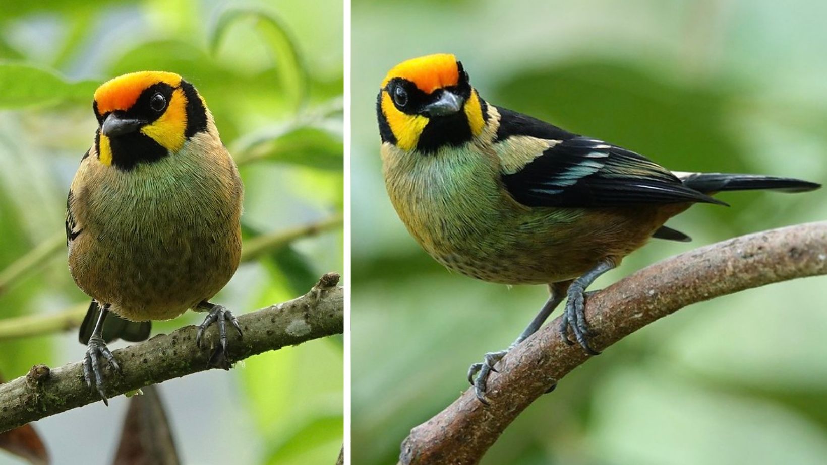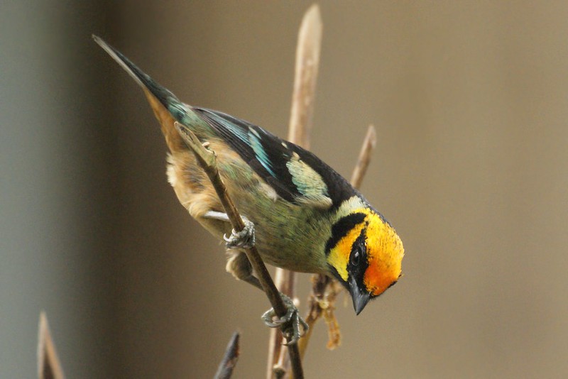 A face full of fiery oranges and yellows contrasts perfectly with a buff suit flecked through with glittering emerald green – meet the flame-faced tanager!