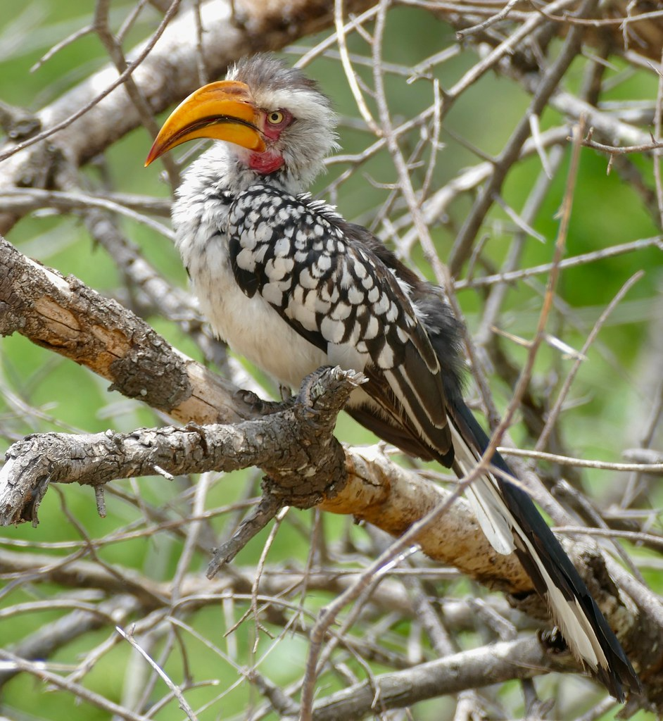 The southern yellow-billed hornbill (Tockus leucomelas) has a long yellow decurved beak, males have a casque above. They have bare red skin around and below the eyes, as well as at the base of the bill. Their eyes are yellow. They have a dark grey forehead and grey at the center of the crown, extending to the nape. Head sides are whitish. Short strong legs and feet are dark grey. The upper parts are black, heavily spotted with white scales on the wings. The back, rump, and long tail are black. Flight feathers are greyish brown, with white edges. Underparts are paler. The neck is white spotted with dark grey, the upper breast is slightly streaked black.