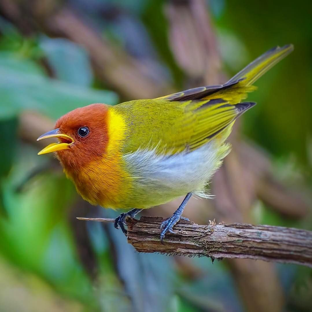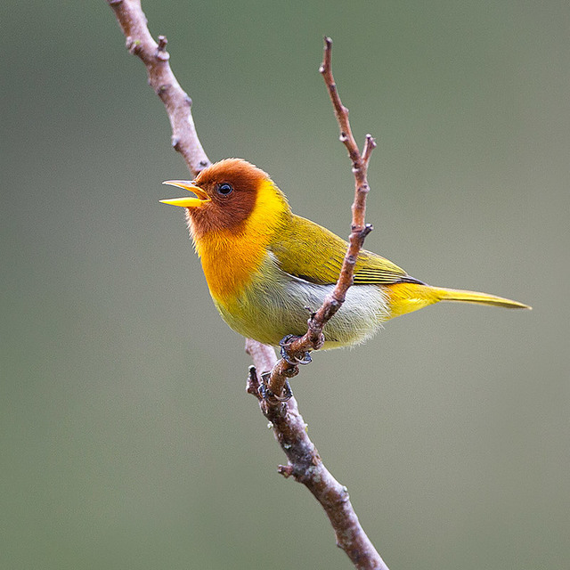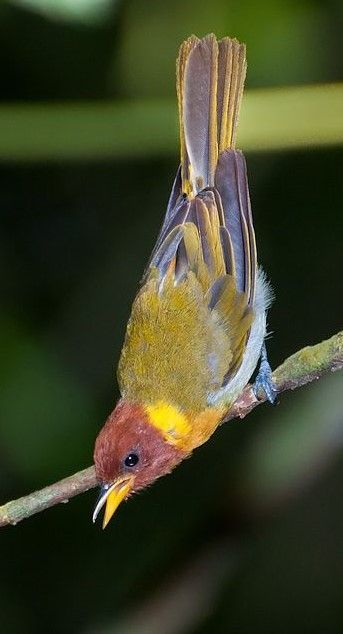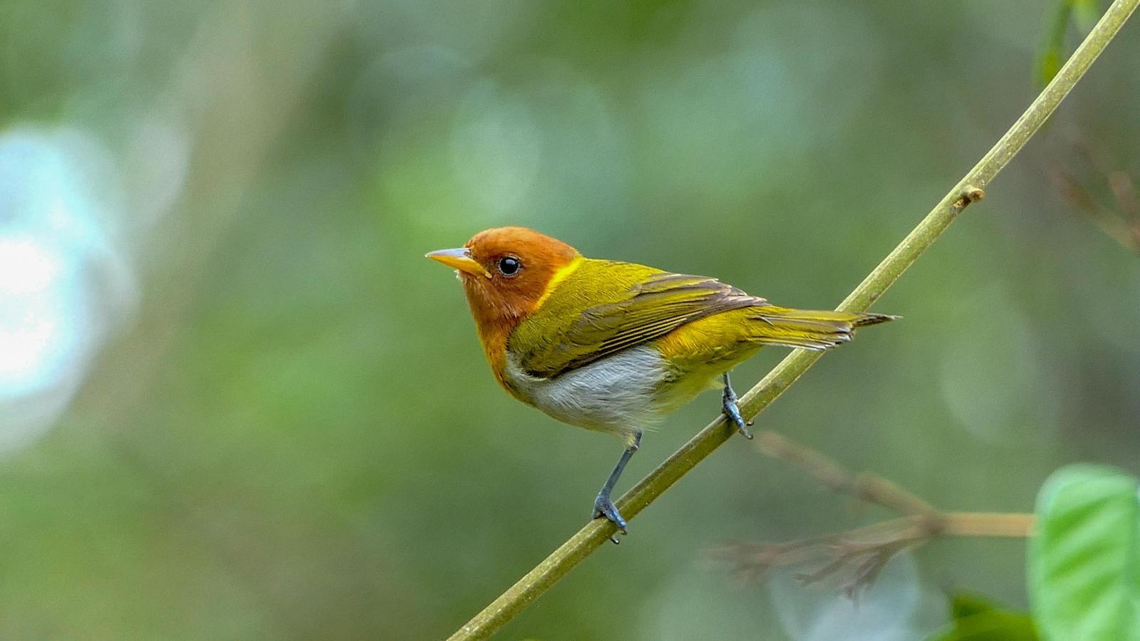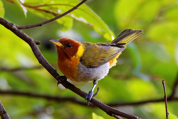 The rufous-headed tanager (Hemithraupis ruficapilla) is a bird with olive-green upper parts and a yellow rump. The head is rufous colored fading to cinnamon on the breast. There are splashes of yellow behind the ear coverts. His underparts are greyish with a yellow center of the belly.