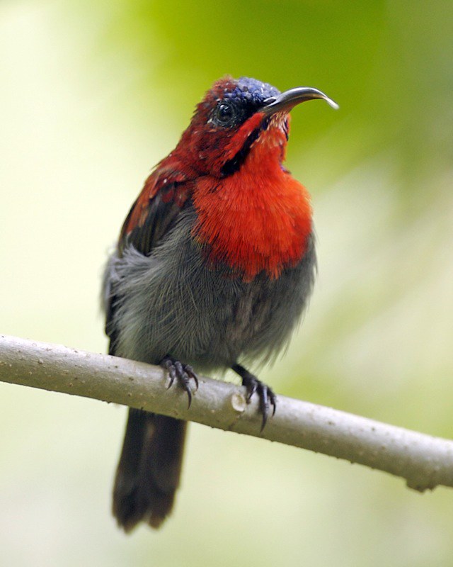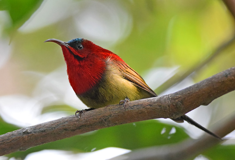 The crimson sunbird (Aethopyga siparaja), is a species of bird in the sunbird family with medium-length thin down-curved bills and brush-tipped tubular tongues, both adaptations to their nectar feeding. The adult male has a bright red throat, chest, and flanks. He also has deep blue mustache-like stripes. His back is maroon-colored, his rump yellow, his abdomen olive-colored. Hid look is finished off with a blue-green tail with white tips on the outer tail feathers.