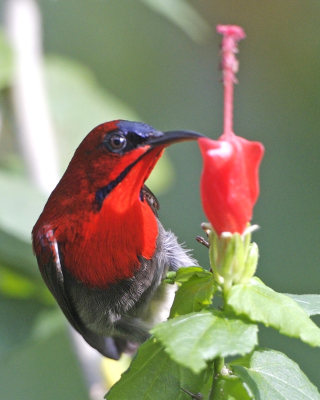Crimson sunbirds like to dine primarily on nectar, though they will eat insects during the breeding season to feed their young as well as satisfy their own need for protein during this time.