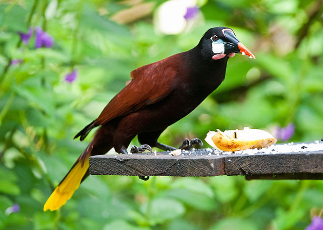 The Montezuma Oropendola (Psarocolius Montezuma), is a New World tropical icterid bird.The male of this species is 50 cm long and weighs in at 520 grams, sporting a mainly chestnut body with a black head and rump. The tale is bright yellow with two dark central feathers. He also wears two blue cheek patches with a pink wattle, eyes are brown, the bill long and black with a red tip.