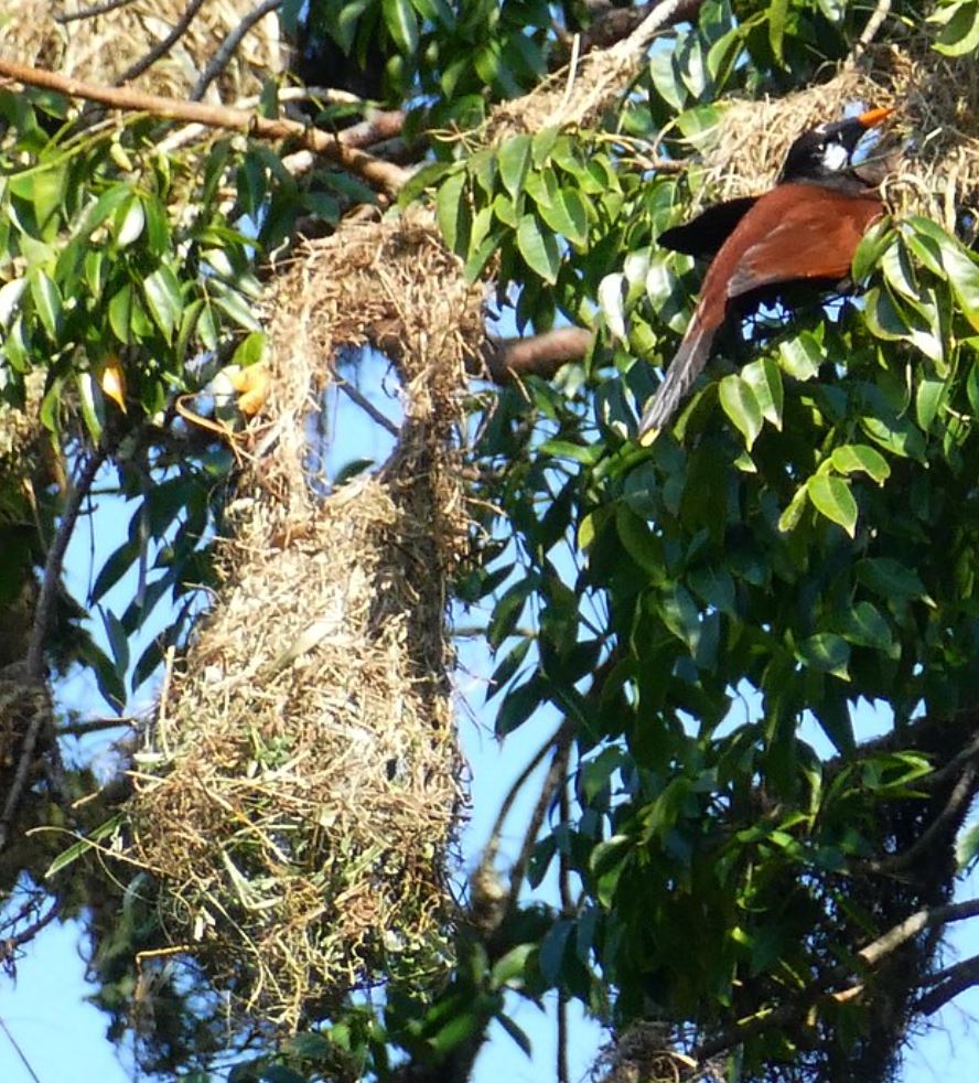 Montezuma Oropendola birds are colonial breeders, meaning they build hanging woven nests woven from fibers and vines in groups. These nests are about 60 – 180 cm long, hanging high in a tree into which the female lays to dar-spotted white eggs which she incubates for around 15 days. Once they hatch it takes the young about 30 days to become fledge. These colonies can have up to around 30 nests with one dominant male who mates with most of the females.