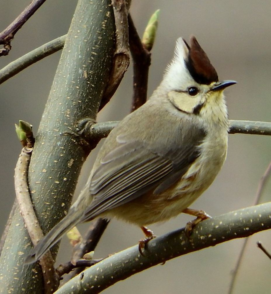 The Taiwan yuhina (Yuhina brunneiceps), also known as Formosan yuhina, is a medium-sized yuhina measuring 13 cm in length. They sport a black mustachioed face, a white throat, and greyish underparts. The wings are a shade of olive-green white the feet yellow and the bill black.