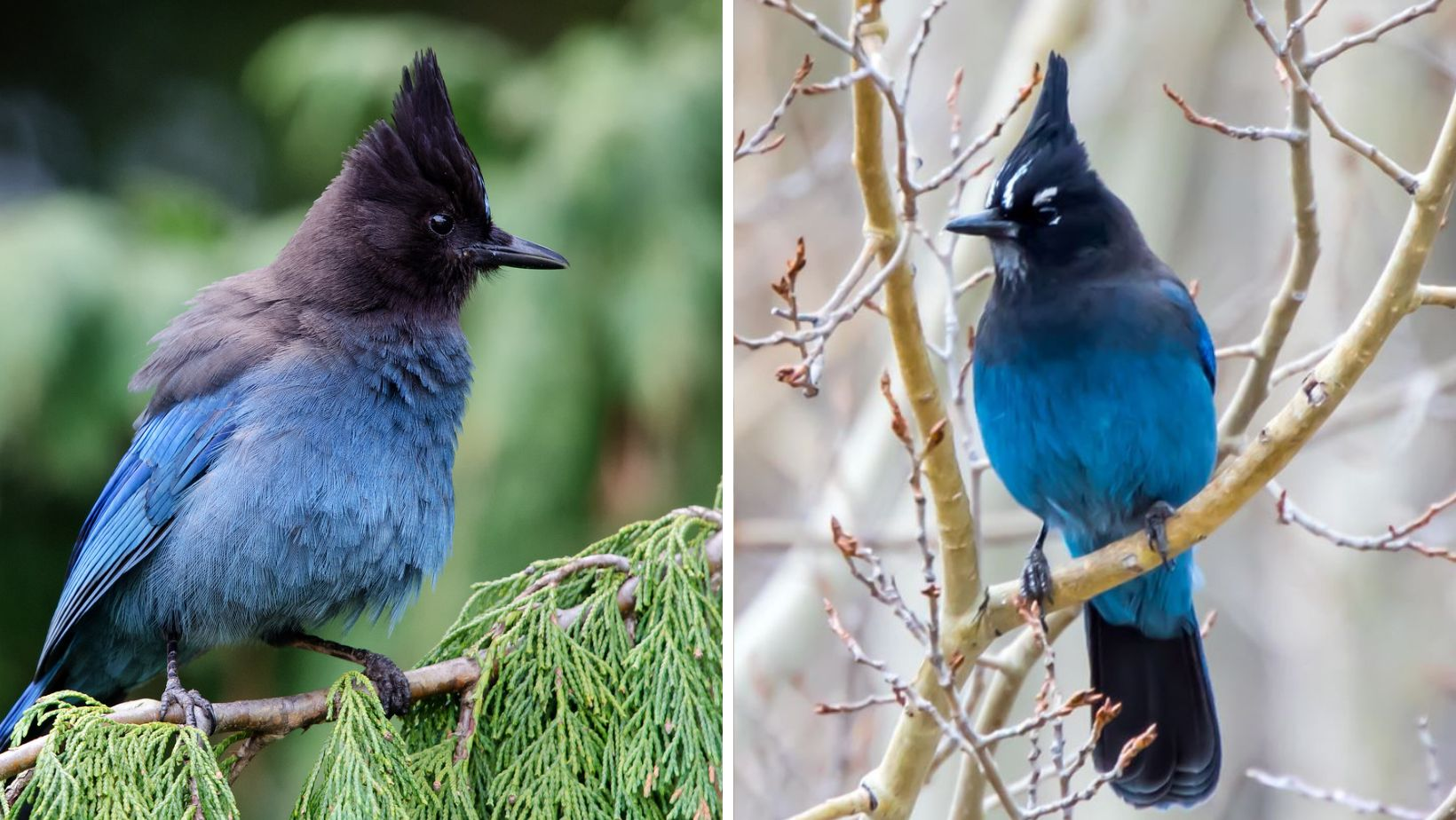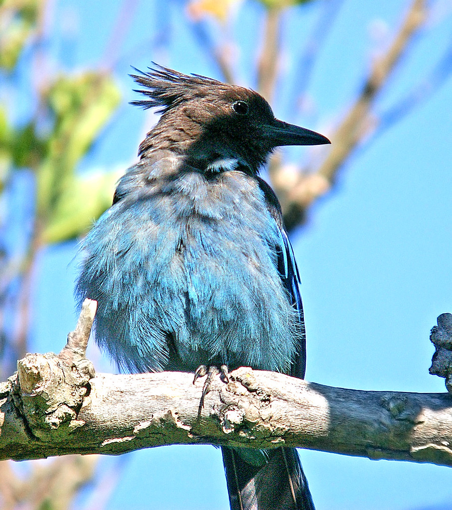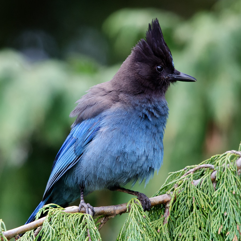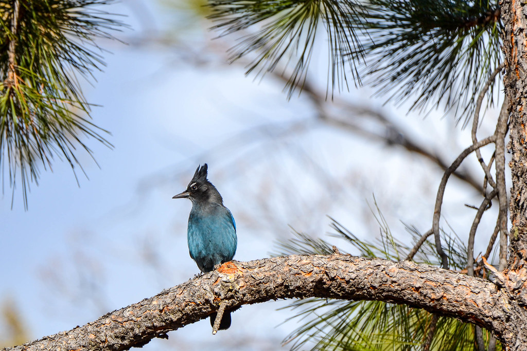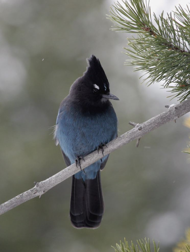 Steller’s jay (Cyanocitta stelleri) is a jay related to the more well-known Blue jay. From a distance they appear quite dark, missing the white underparts of other jay species. The head is dark black, going almost all the way down the back, while the rest of the body is blue. White markings appear above both eyes but are very easy to miss. A large songbird they have rounded wings and a long full tail. The beak is long, straight, and powerful, while on top of their head sits a prominent triangular crest that stands almost straight up.