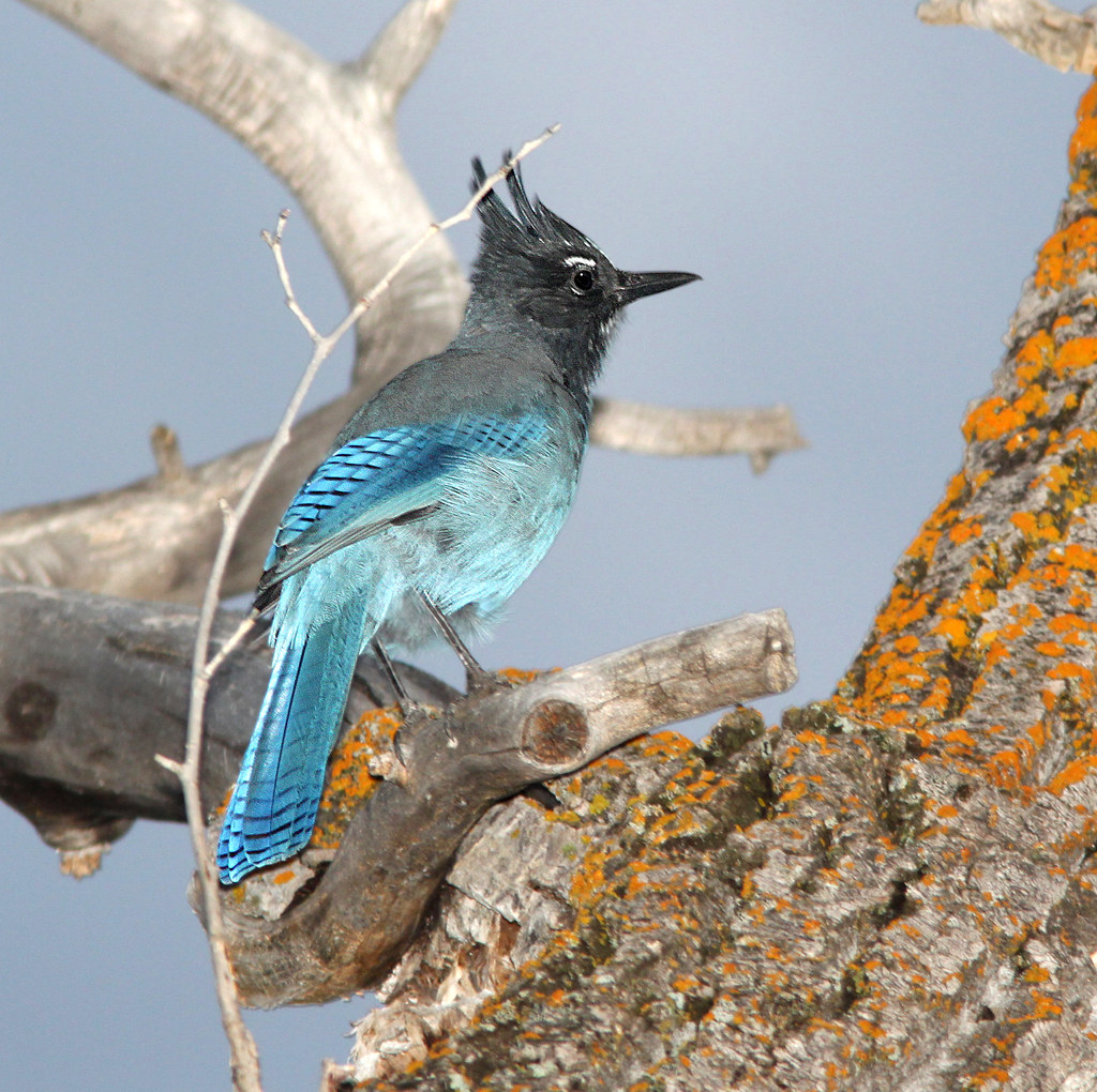 Widely spread throughout its range, Steller’s jay sometimes hangs out with other species of jay like the California Scrub jay above. Steller’s jay is regarded as at Least Risk on the IUCN red list.