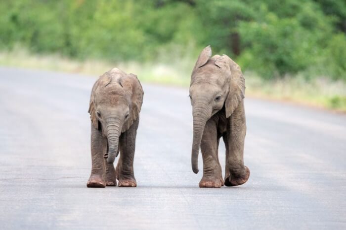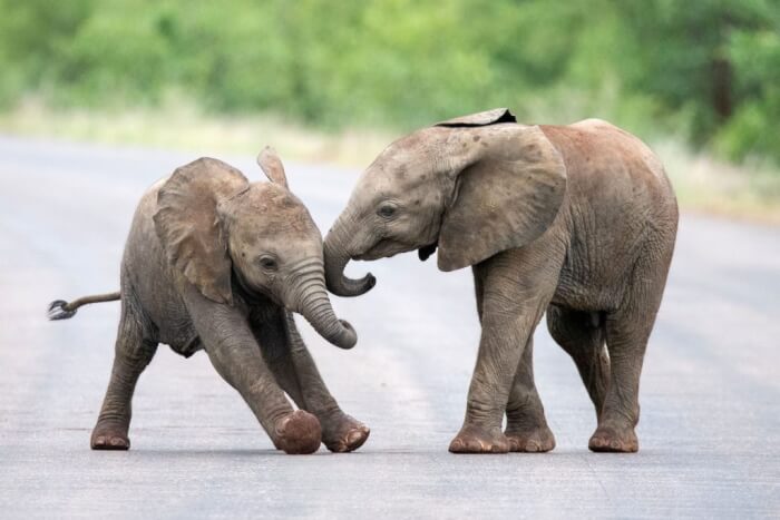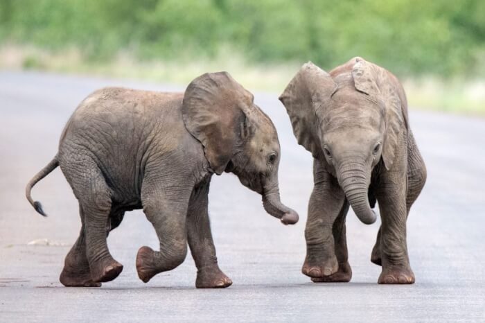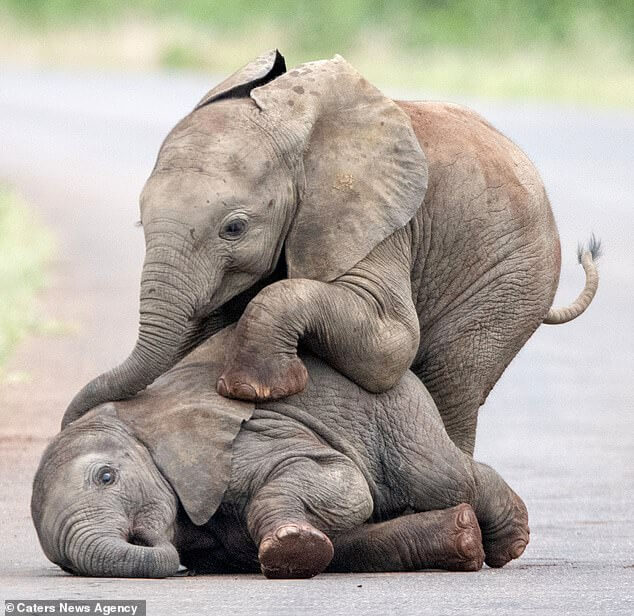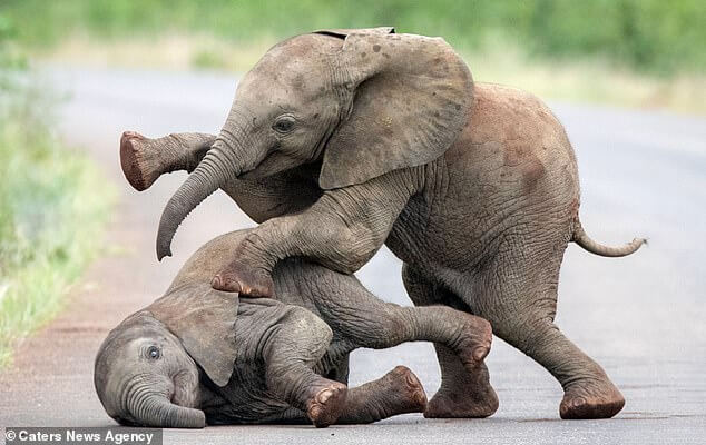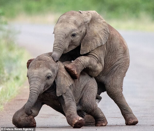 If you are looking for something positive to spice up your day, this video is just for you. Two baby elephant buddies are spotted frolicking in the middle of the road, climbing on top of each other, and slamming into each other.