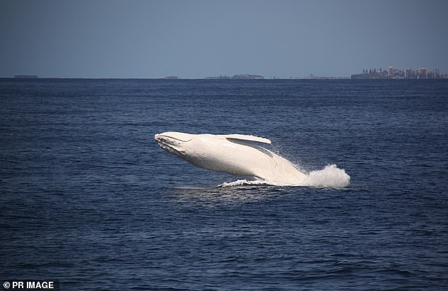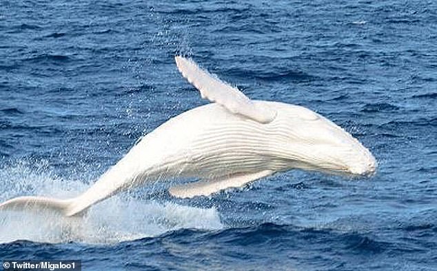 A 16-year-old caught a white humpback (pictured) frolicking along the east coast with a pod of whales using his drone