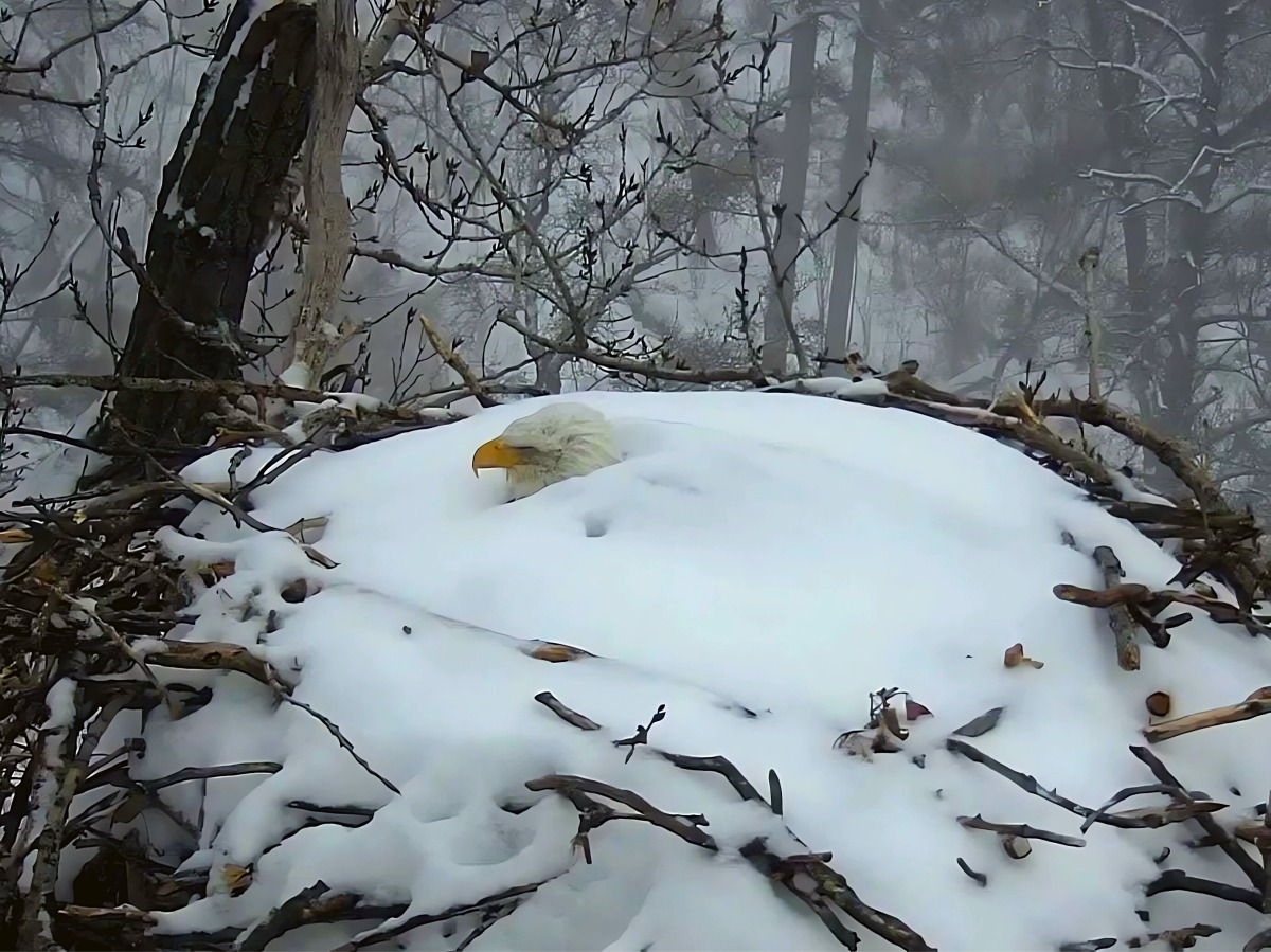 A bald eagle was spotted refusing to leave its eggs behind during a blizzard, even when it got covered in snow up to its neck, with only its head poking out.
