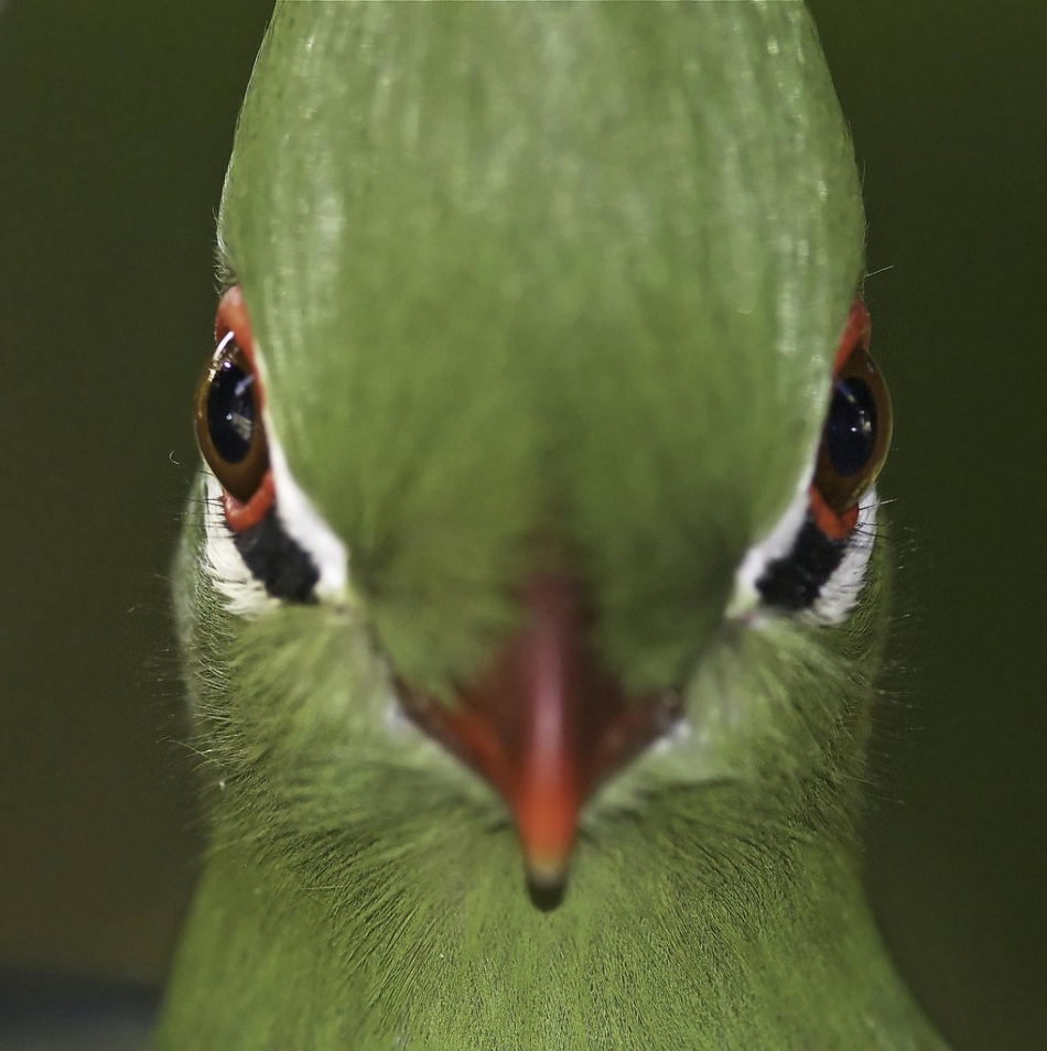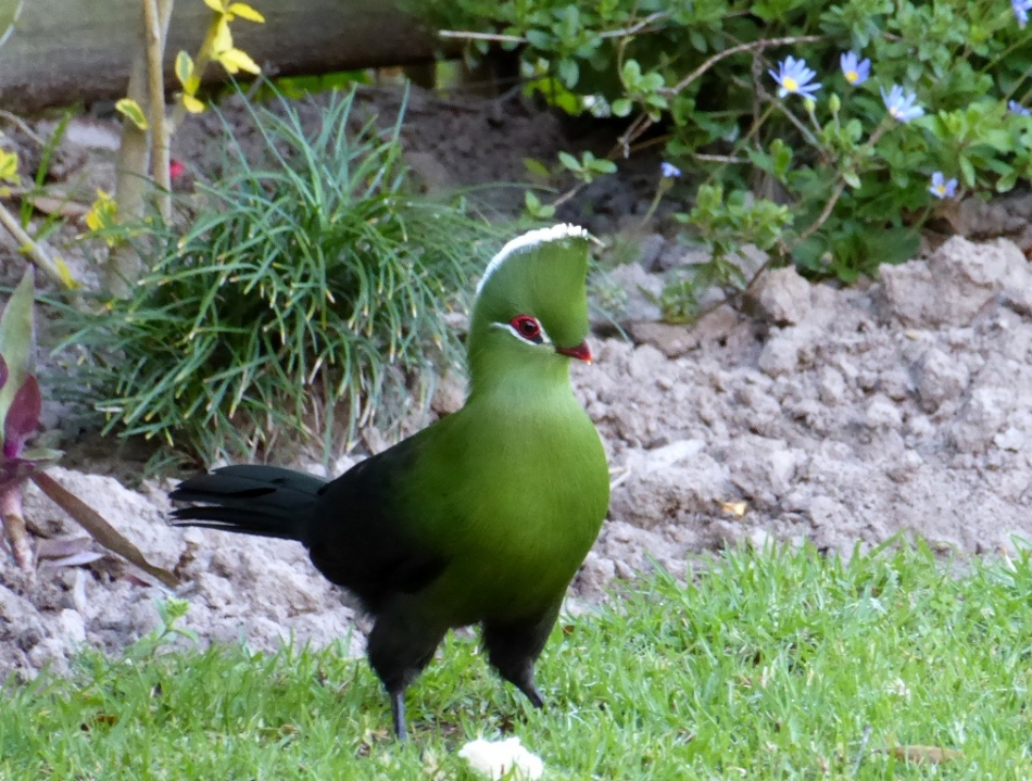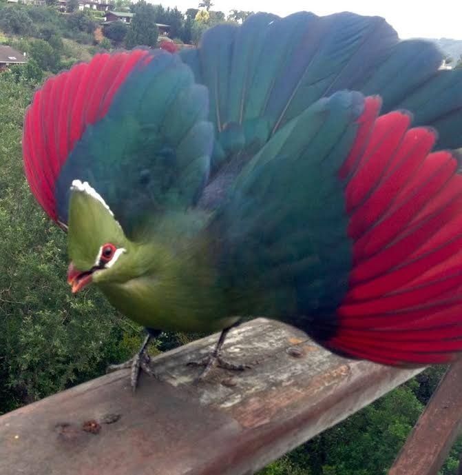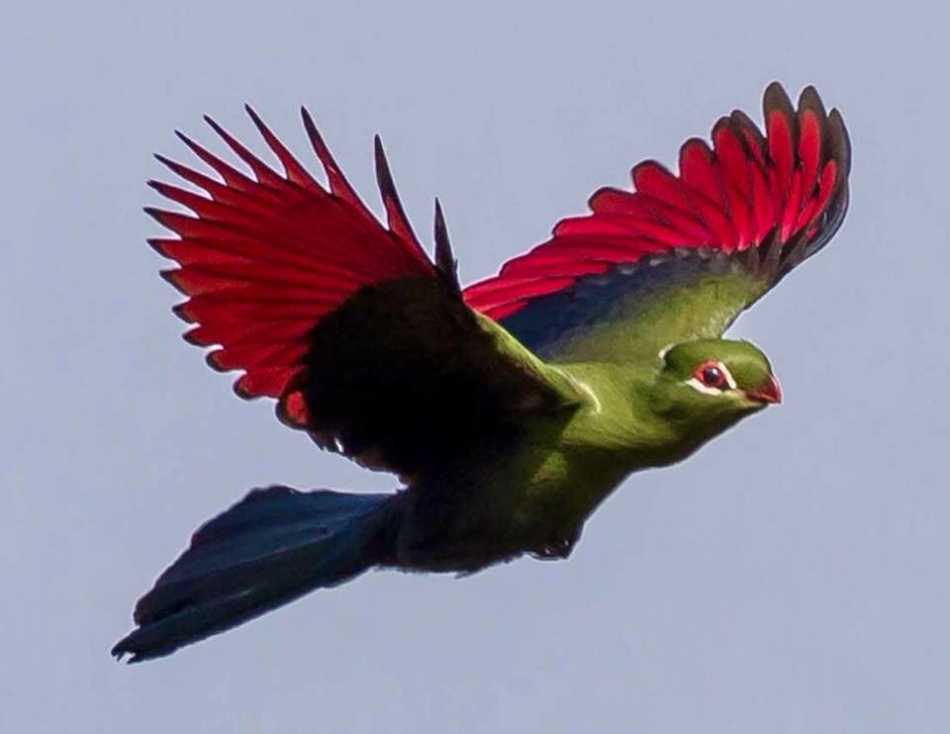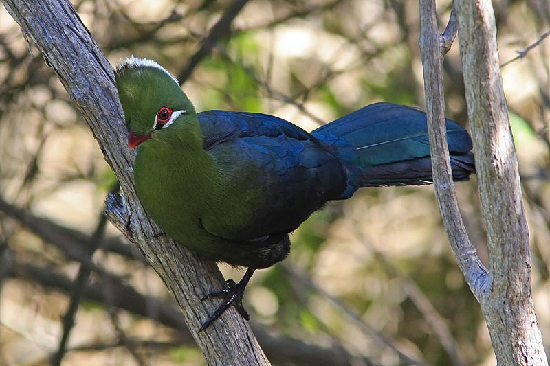 The Knysna turaco is usually seen flying between forest trees, or hopping along branches. It feeds on fruit, insects and earthworms. It has a loud kow-kow-kow-kow call. This bird family is known as Loeries in South Africa, but the international name is Turaco. Turacos (the 10 species of the Tauraco and the 2 of the Musophaga) are the only birds to possess true red and green colour. When you look at most birds, the color you are seeing is a reflection produced by the feather structure. The turaco’s red pigment (turacin) and green pigment (turacoverdin) both contain copper. In fact, if you stirred a glass of water with a red turaco feather, the water would turn pink! In museum species, the pigments deepen with age because the copper begins to oxidize.