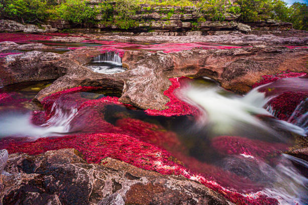 Caño Cristales is a fast-flowing river with many rapids and waterfalls. Small circular pits known as giant’s kettles can be found in many parts of the riverbed, which have been formed by pebbles or chunks of harder rocks. Once one of these harder rock fragments falls into one of the cavities, it is rotated by the water current and begins to carve at the cavity wall, increasing the dimensions of the pit.