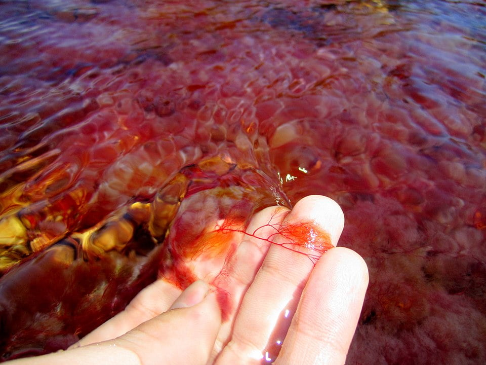The river is home to a wide variety of aquatic plants. Its water is extremely clear due to the lack of nutrients and small particles – which also explain the abscence of fish. Almost unique is the bright red – pink coloration of riverbed after the rainy period in the end of June – November, caused by the endemic plant species Macarenia clavígera.
