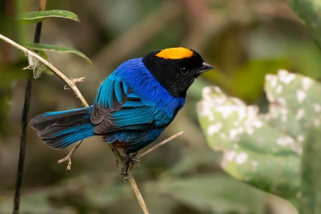 The golden-crowned tanager is among these strikingly beautiful birds. Most of its body is covered with charismatic cobalt blue, except for the bright yellow crown and jet black head and neck. There are also yellow feathers on its rump and black feathers on its blue tail.