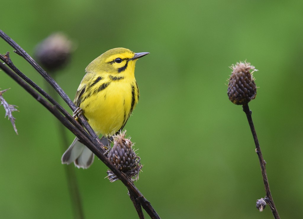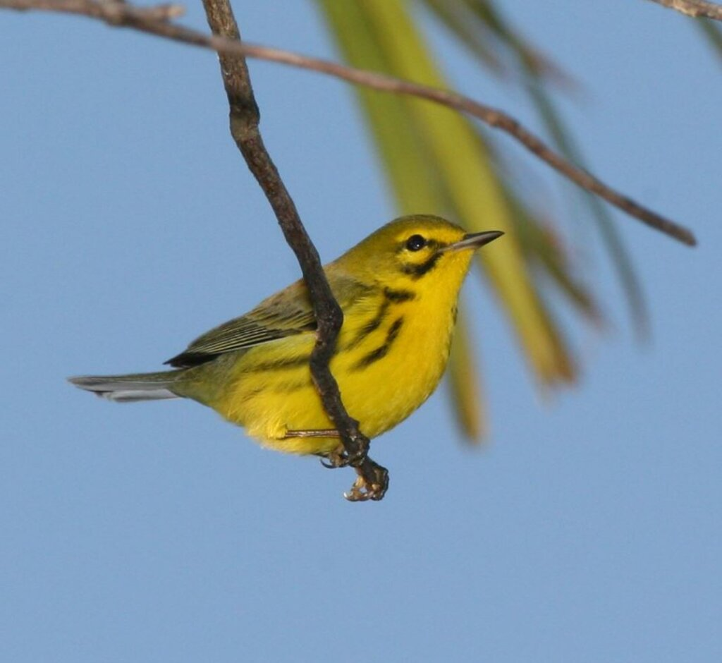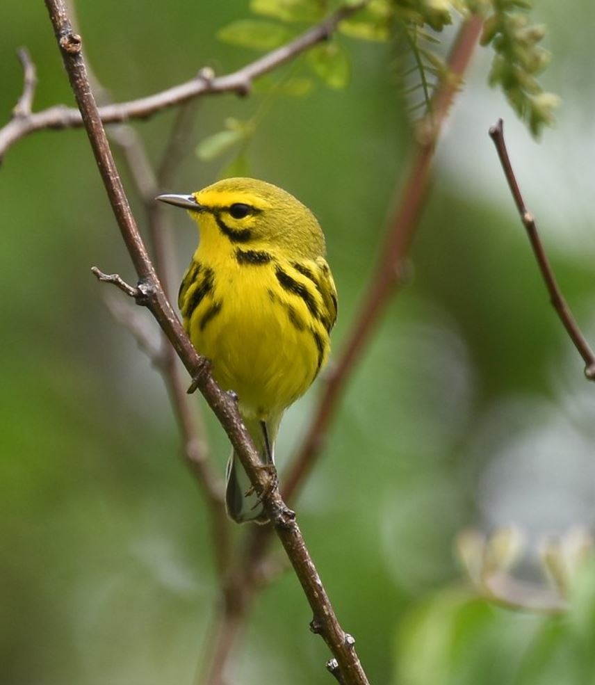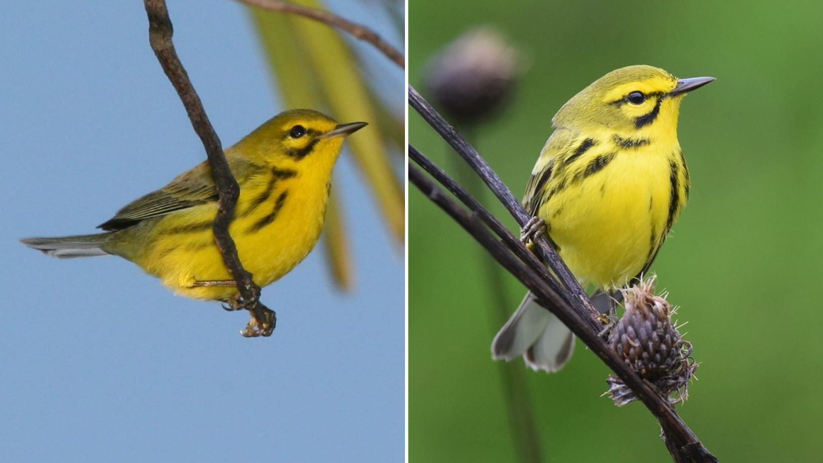The prairie warbler (Setophaga discolor) is a bird that has yellow underparts with dark streaks on the flanks, and olive upperparts with rusty streaks on the back; they have a yellow line above the eye, a dark line through it, and a yellow spot below it.