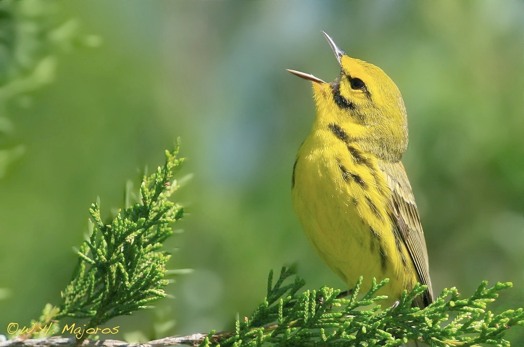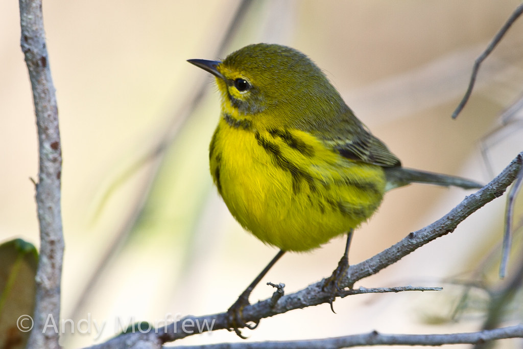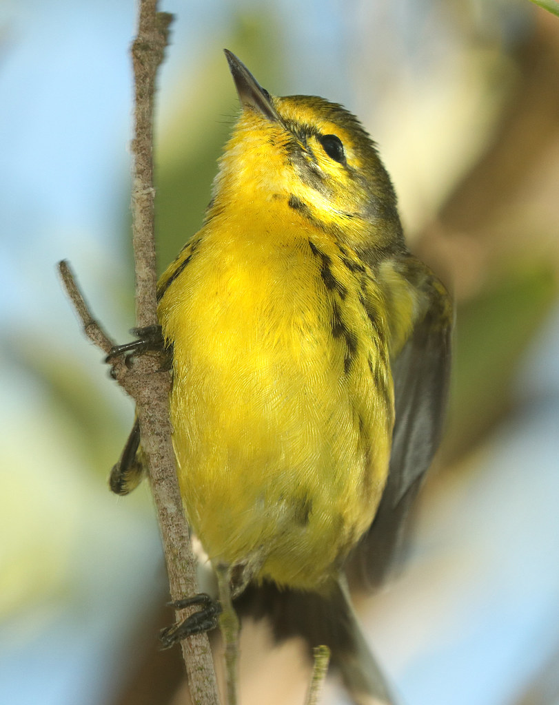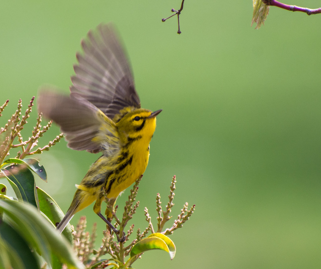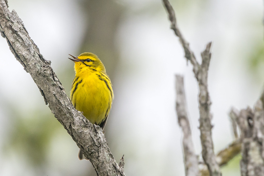The prairie warbler (Setophaga discolor) is a bird that has yellow underparts with dark streaks on the flanks, and olive upperparts with rusty streaks on the back; they have a yellow line above the eye, a dark line through it, and a yellow spot below it.