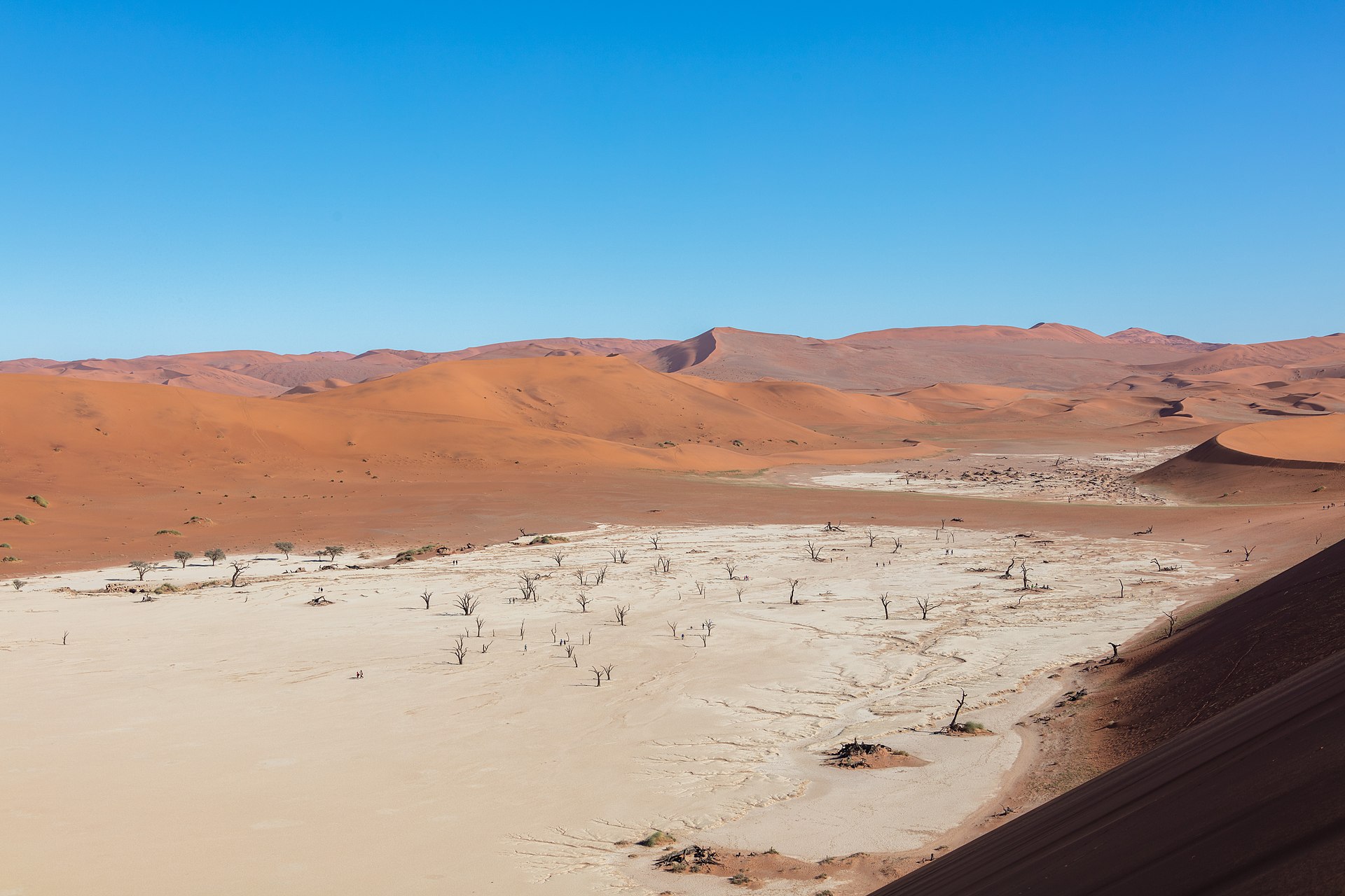 The clay pan formed due to rainfall and the flooding Tsauchab river, creating temporary shallow pools where the abundance of water allowed camel thorn trees to grow. When the climate changed, drought hit the area, and sand dunes encroached on the pan, which blocked the river from the area.