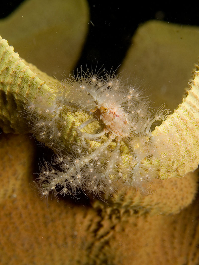 Other decorator crabs take advantage of the hydrozoan Hydrichthella epigorgia, which, like corals, is made up of a myriad of tiny polyps that act together as one collective organism. Unlike most hydrozoans, however, the polyps of this species do not sport feeding tentacles but instead sticky polyps that catch microscopic food and slowly transfer them to the animal’s ‘mouth’. Some particularly cunning species have taken advantage of this by covering their front legs in H. epigorgia to create a pair of sticky and effective fishing rods.
