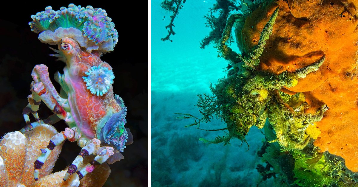 This decorator crab has decorated himself with bits and pieces mostly from other living organisms to perfectly blend into its environment. It’s extremely hard to tell it’s a crab unless it’s moving. Image credit: Chika Watanabe