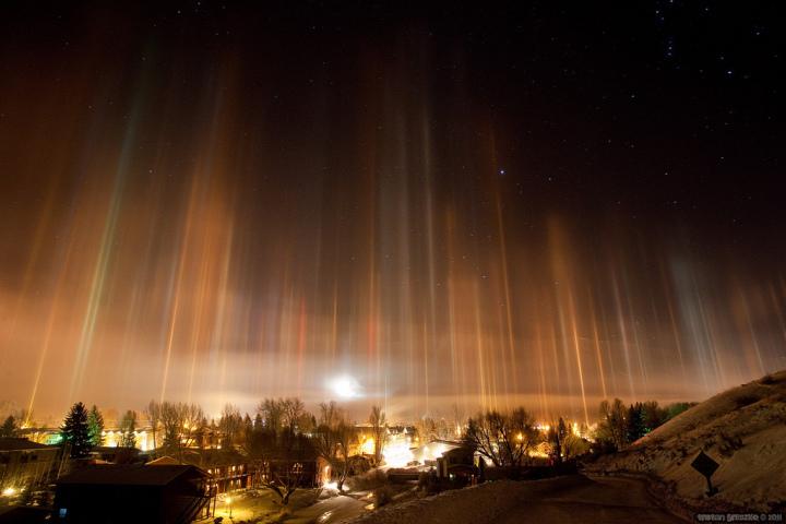 Light pillars appear when artificial light or natural light bounces off the facets of flat ice crystals wafting relatively close to the ground.When the light source is close to the ground, the light pillar appears above the floating crystals. When the light comes from the sun or moon, the light pillar can appear beneath them, too, as the light refracts through the crystals. The light can come from the Sun (usually when it is near or even below the horizon) in which case the phenomenon is called a sun pillar or solar pillar. It can also come from the Moon or from terrestrial sources such as streetlights.