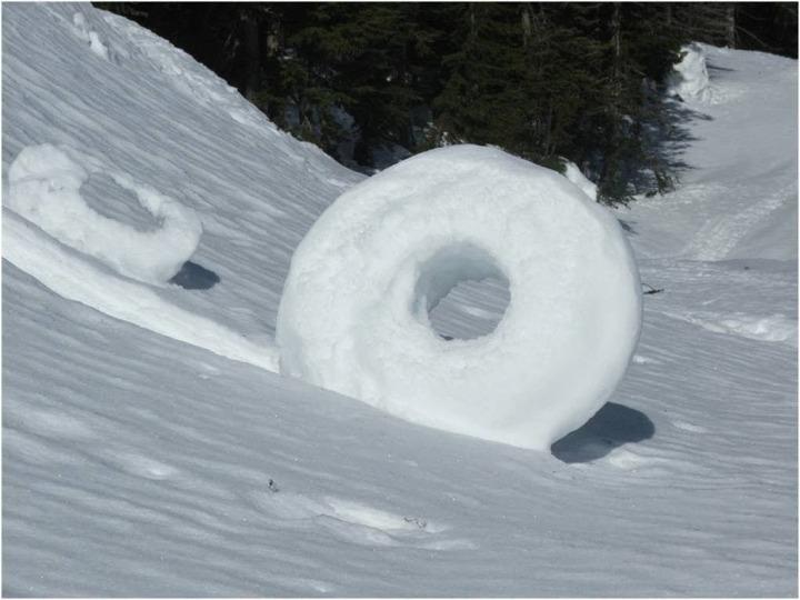 Snow donuts are formed when a clump of snow falls off of a cliff or a tree into the snow pack. And if the conditions and temperature are just right, as gravity takes over, it pulls the snow down, and it rolls back on itself. Usually the center collapses and it creates what we call a pinwheel. But when the hole stays open, it creates a shape that resembles a car tire covered with ice, or a gigantic, white Cheerio!