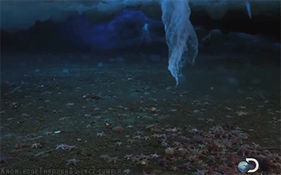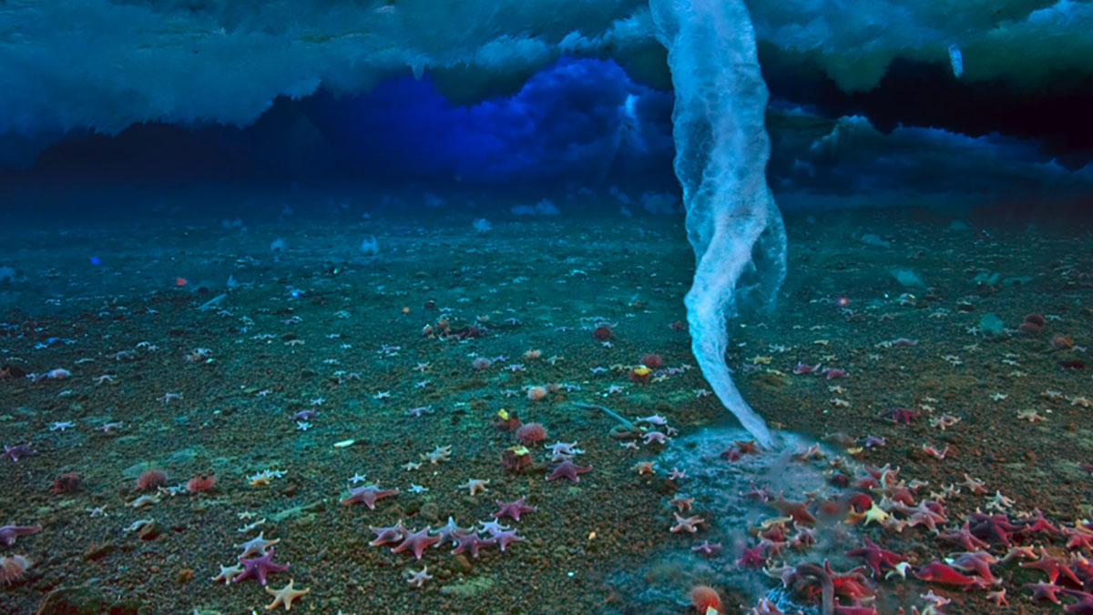 A brinicle forms beneath sea ice when a flow of extremely cold, saline water is introduced to an area of ocean water, being the undersea equivalent of a hollow stalactite or icicle.