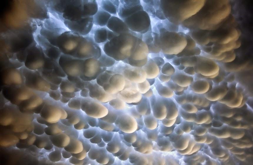 Mammatus is a meteorological term applied to a cellular pattern of pouches hanging underneath the base of a cloud. They are pouch-like cloud structures and a rare example of clouds in sinking air. As updrafts carry precipitation enriched air to the cloud top, upward momentum is lost and the air begins to spread out horizontally, becoming a part of the anvil cloud. Because of its high concentration of precipitation particles (ice crystals and water droplets), the saturated air is heavier than the surrounding air and sinks back towards the earth.The temperature of the subsiding air increases as it descends. However, since heat energy is required to melt and evaporate the precipitation particles contained within the sinking air, the warming produced by the sinking motion is quickly used up in the evaporation of precipitation particles. If more energy is required for evaporation than is generated by the subsidence, the sinking air will be cooler than its surroundings and will continue to sink downward. The subsiding air eventually appears below the cloud base as rounded pouch-like structures called mammatus clouds.