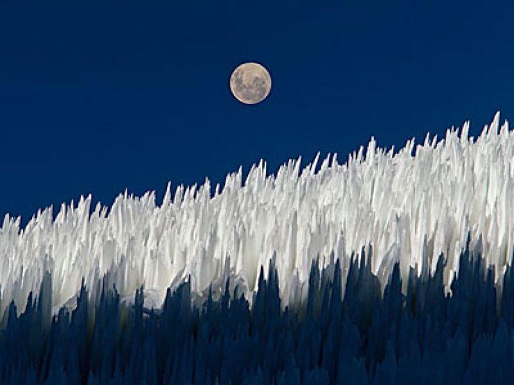 These marvelous structures are tall thin blades of hardened snow or ice closely spaced with the blades oriented towards the general direction of the sun. They usually formed in clusters and range from a few centimetres to 2 meters but penitentes as high as 5 meters has been recorded. These pinnacles of snow or ice grow over all glaciated and snow covered areas in the Dry Andes above 4,000 meters. Penitentes are a common sight in the regions between Argentina and Chile. They form when the sun’s rays turn snow directly into water vapor without melting it first, a process called sublimation. An initially smooth snow surface first develops depressions as some regions randomly sublimate faster than others. The curved surfaces then concentrate sunlight and speed up sublimation in the depressions, leaving the higher points behind as forests of towering spikes.
