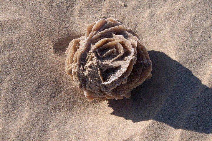 Desert rose is the colloquial name given to rose-like formations of crystal clusters ofgypsum or baryte which include abundant sand grains. The ‘petals’ are crystals flattened on the c crystallographic axis, fanning open in radiating flattened crystal clusters.The rosette crystal habit tends to occur when the crystals form in arid sandy conditions, such as the evaporation of a shallow salt basin. The crystals form a circular array of flat plates, giving the rock a shape similar to a rose blossom. Gypsum roses usually have better defined, sharper edges than baryte roses. The ambient sand that is incorporated into the crystal structure, or otherwise encrusts the crystals, varies with the local environment. If iron oxides are present, the rosettes take on a rustic tone.