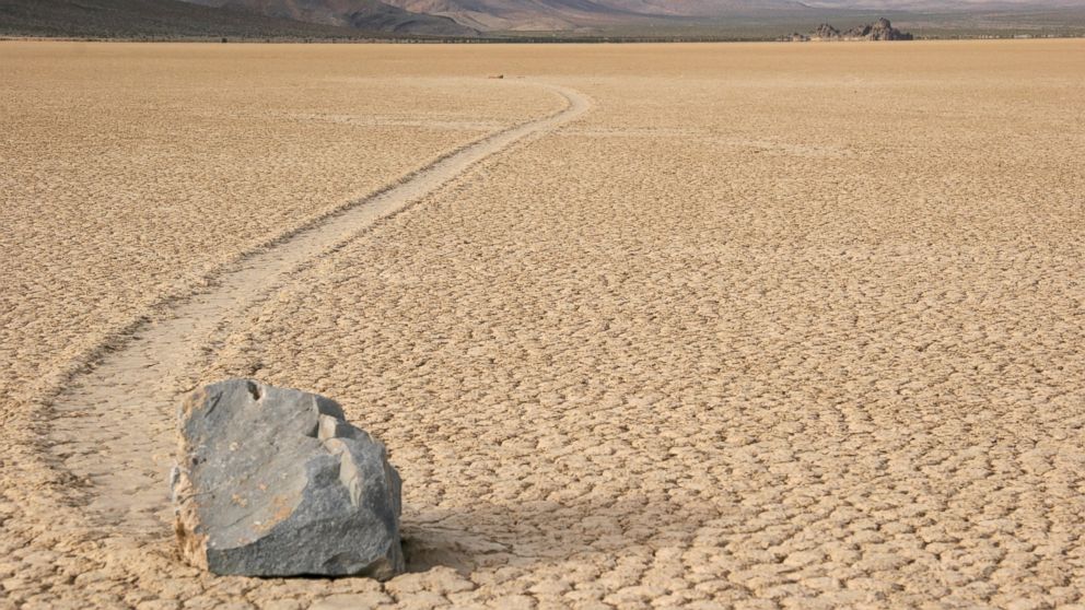 Sailing stones refer to a geological phenomenon where rocks move and inscribe long tracks along a smooth valley floor without human or animal intervention.These stones can be found on the floor of the playa with long trails behind them. Somehow the stones slide across the playa, cutting a furrow in the sediment as they move. Experiments show that moving of stones requires a rare combination of events. First, the playa fills with water, which must be deep enough to form floating ice during cold winter nights but shallow enough to expose the stones. As nighttime temperatures plummet, the pond freezes to form thin sheets of ‘windowpane’ ice, which must be thin enough to move freely but thick enough to maintain strength. On sunny days, the ice begins to melt and break up into large floating panels, which light winds drive across the playa, pushing rocks in front of them and leaving trails in the soft mud below the surface. Several other theories have been proposed for this phenomena but none have been able to explain it clearly. Some of the stones weigh more than 300 kg. That makes the question: “what powerful force could be moving them?”