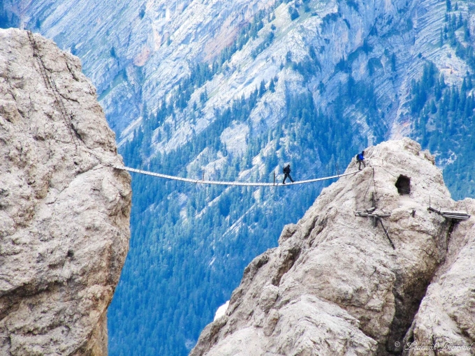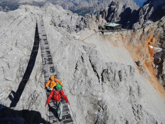 The bridge leads to Forcella Staunies. This is one of the magnificent, stimulating but dangerous highlights on the Via Ferrata Ivano Dibona route. Photo: Summit post.