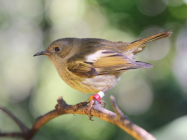 Female stitchbirds are very different from males in color, they can be differentiated by mainly greenish brown with yellow tinges and white wing bars.